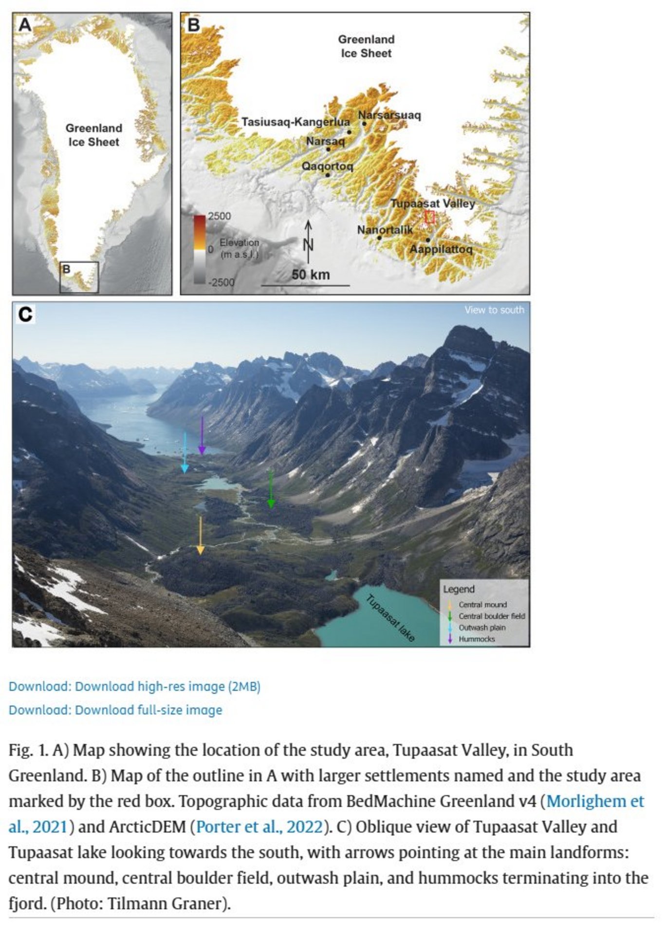 Deposits of a giant (more than 1 km3) rock-ice avalanche with a runout of 15.8 km and an associated failure scar have been discovered in Tupaasat Valley, South Greenland (Kalaallit Nunaat). To study its formation, a geomorphological map of the area has been produced using mainly remote sensing, while the age of the landforms has been constrained based on 10Be cosmogenic nuclide exposure dating. The rock-ice avalanche landforms include a 1100 m wide mound of displaced material located approximately 6.4 km from the scar, at a change in slope from around 4° to 1.5°. A boulder field containing boulders up to 45 m across lies 0.5 km farther down the valley. Beyond the boulder field are kettle holes up to 45 m in diameter and debris cones interpreted as molards reaching heights up to 36 m and diameters up to 140 m. The source area of the rock-ice avalanche is on a mountain crest above a present-day glacier. The rock-ice avalanche landforms yielded 10Be ages ranging from c. 12.3 to 9.5 ka with a weighted mean of 10.9 ± 0.5 ka, which coincides with the generally known deglaciation age of the valley. Based on our results, we suggest that the rock-ice avalanche was preconditioned by glacial debuttressing during the deglaciation of the valley and created a tsunami when it impacted a nearby fjord. Such events are expected to be more frequent due to climate change and future ice loss and pose a hazard for populations located near glaciated valleys. A better understanding of past events can help mitigate future large rock-slope failures.