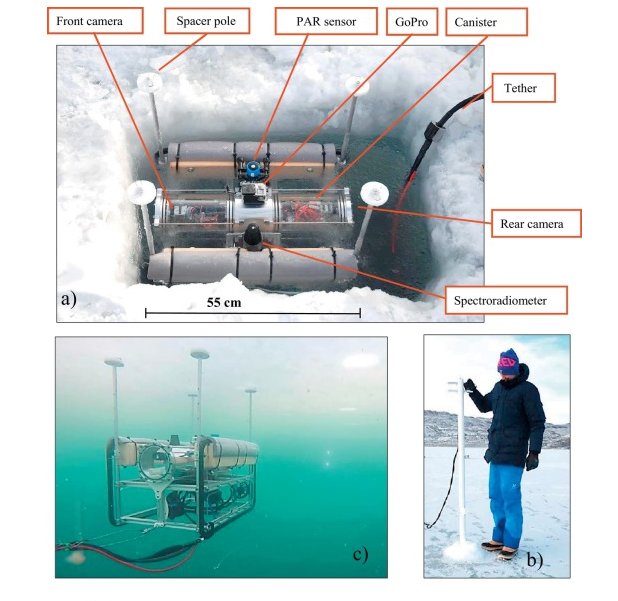 Here we describe the design, performance and field tests of a lightweight (13.1 kg), low-cost (15.000 USD), and portable remotely operated vehicle (ROV) of dimensions 55 × 43 × 34 cm (L × H × W), with a new optical based positioning system. The ROV is designed for deployments and measurements of the irradiance field at a short distance below sea ice bottom in landfast level sea ice at calm under ice conditions. It is equipped with two cameras (front and rear) for optical positioning based on reference poles with LED lights below the ice. A third upward camera is for guiding during deployment and positioning. The ROV is equipped with spacer poles to maintain a constant distance between ROV with onboard optical sensors and bottom of the ice. All pre-tests of housing, thrusters, optical positioning, and ROV maneuverability were carried out in freshwater basins prior to field trials and tests. These were conducted at Kangerlussuaq, West Greenland on landfast first-year 79–80 cm thick ice with a variable (1–12 cm) snow cover in March 2016. The ROV was easily deployed through a hole (75 × 50 cm) in the ice and easy to maneuver below the ice. Test of positioning system showed an average deviation of 28 ± 5 cm between optically based position and actual position with an average offset from center line of 16 ± 5 cm. The ROV was applied for measuring the under-ice irradiance field and results demonstrated a solid negative correlation between snow depth and PAR transmittance. We derived a Normalized Differences Index (NDI) for snow depths: NDIsnow depth = [E(610 nm) – E(490 nm)]/[E(610 nm) + E(490 nm)] with minimum attenuation at 490 nm and maximum at 610 nm. It is discussed that the correlations for both PAR transmittance and the NDI with snow depths are due to a combination of a constant distance between optical sensor and ice bottom, and accurate positioning. A test showed that the wakes of thrusters removed parts of the ice algae biomass, but the study demonstrates the applicability of this ROV design for measurements of the under-ice irradiance field below landfast sea ice with a new optical based positioning system.