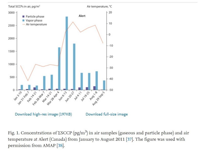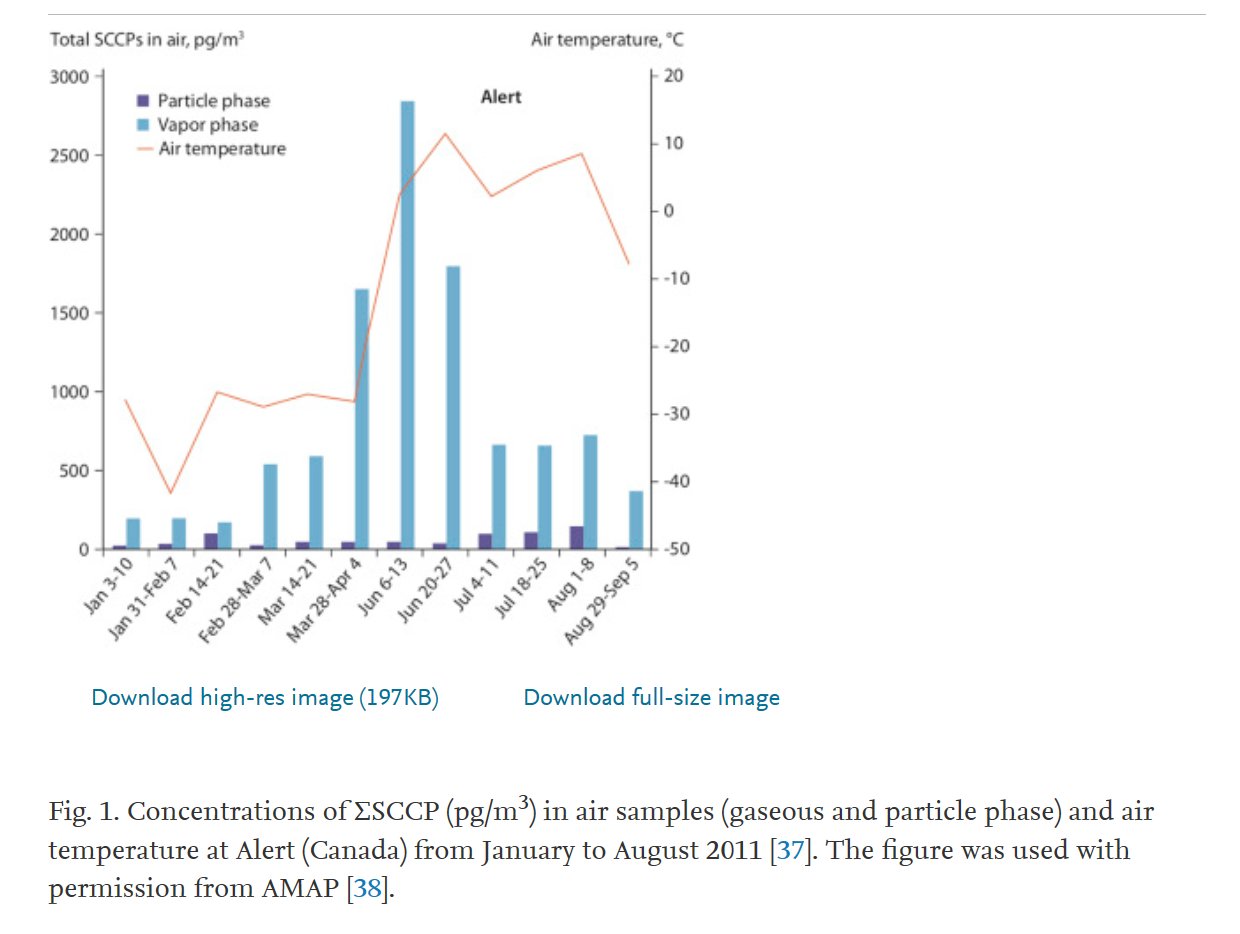 Chlorinated paraffins (CPs) present a complex mixture of congeners which are often analysed and assessed as short-, medium- and long-chain CPs, i.e. ΣSCCP (C10–C13), ΣMCCP (C14–C17) and ΣLCCP (≥C18). Their complexity makes the chemical analysis challenging, in particular in terms of accurate quantification, but promising developments involving ultra-high resolution mass spectrometry have been presented lately. Most Arctic data exist for SCCPs, while LCCPs have not yet been studied in the Arctic. ΣSCCP concentrations in Arctic air often exceeded those of ΣMCCP, usually with a predominance of the most volatile C10 congeners, and of banned persistent organic pollutants (POPs), such as polychlorinated biphenyls (PCBs). The presence of SCCPs and MCCPs in Arctic air, as well as in the Antarctic and in the remote regions of the Tibetan plateau, provides evidence of their long-range transport including sufficient environmental persistence to reach the Arctic. Arctic vegetation accumulated SCCPs partly from air and partly through root uptake from soil, with consequences for the SCCP profile found in Arctic plants. No results have yet been reported for CPs in terrestrial Arctic animals. Results for freshwater sediment and fish confirmed the long-range transport of SCCPs and MCCPs and documented their bioaccumulation. Where additional PCB data were available, ΣPCB was usually higher than ΣSCCP in freshwater fish. Both SCCPs and MCCPs were widely present in marine Arctic biota (e.g. mussels, fish, seabirds, seals, whales, polar bears). In mussels and Atlantic cod, ΣMCCP concentrations exceeded those of ΣSCCP, while this was less clear for other marine species. Marine mammals and the long-lived Greenland shark roughly had ΣSCCP concentrations of 100–500 ng/g lipid weight, often dominated by C11 congeners. Biomagnification appeared to be more pronounced for ΣSCCP than for ΣMCCP, but more studies will be needed. Increasing ΣSCCP concentrations were observed in Arctic air and sediment over time, but not in beluga monitored since the 1980s. For both SCCPs and MCCPs, increasing concentrations over time have been shown in blue mussels and Atlantic cod at some, but not all stations. Indications exist of local sources of SCCPs in the Arctic, including Arctic settlements and research stations. In studies involving multiple locations, a general decrease of SCCP concentrations with increasing latitude or distance from point sources was observed as well as relatively more MCCPs at locations closer to potential CP sources. Monitoring of SCCPs and MCCPs has been initiated in some Arctic regions and will be important to assess the effect of recent regulations of SCCPs and the use of potential replacement chemicals.