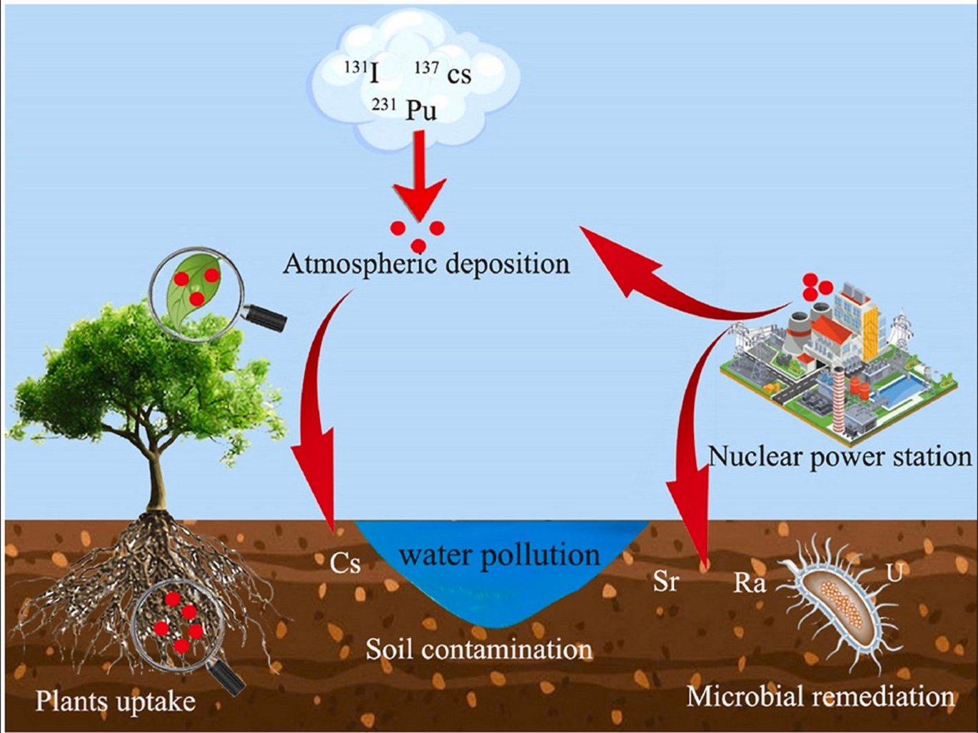 Radionuclides released from nuclear contamination harm the environment and human health. Nuclear pollution spread over large areas and the costs associated with decontamination is high. Traditional remediation methods include both chemical and physical, however, these are expensive and unsuitable for large-scale restoration. Bioremediation is the use of plants or microorganisms to remove pollutants from the environment having a lower cost and can be upscaled to eliminate contamination from soil, water and air. It is a cheap, efficient, ecologically, and friendly restoration technology. Here we review the sources of radionuclides, bioremediation methods, mechanisms of plant resistance to radionuclides and the effects on the efficiency of biological adsorption. Uptake of radionuclides by plants can be facilitated by the addition of appropriate chemical accelerators and agronomic management, such as citric acid and intercropping. Future research should accelerate the use of genetic engineering and breeding techniques to screen high-enrichment plants. In addition, field experiments should be carried out to ensure that this technology can be applied to the remediation of nuclear contaminated sites as soon as possible.