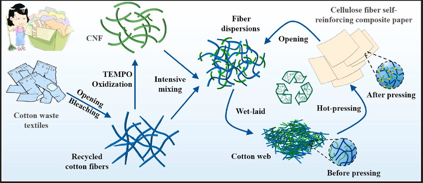 Over 100 million tons of cotton waste are produced annually, representing 35–40% of global textile waste. However, less than 30% of cotton waste is recycled annually. In particular, the fibers less than 7 mm in length dropped during the opening and carding process of cotton waste fabrics have not found a mature utilization method. This work demonstrates and reveals a strategy to transform short cotton fibers into a renewable cellulose fiber self-reinforcing composite paper (CCP). Recycled cotton staple fibers less than 3 mm were prepared into CNFs by TEMPO oxidation. The use of recycled cotton fiber (3–7 mm) as reinforcement and CNFs as a matrix results in a composite material bonded through hydrogen bonding. The recovered cotton fibers and CNFs soliquoid combine together to form a paper pulp, which is then transformed into CCP using wet-laid webs and hot-pressing techniques. When the CNF content reached 5%, the tensile strength of CCP was 86.68 MPa, which is 1.8 times that of the commercial A4 paper. The tensile strength of the CCP only decreases by 25% from the dry state to the wet state, while that of A4 paper after soaking water is almost zero. This makes CCP a special paper with broad application prospects. Since CNF extracted from cotton waste textiles is used as a strengthening agent and without any chemical adhesives added in the paper-making process, which makes the production process of CCP cleaner and can be recycled in a closed loop. Overall, the promising strategy achieves at least four objectives related to cleaner production: maximum recycling of cotton waste, CNF instead of traditional chemical adhesives used in paper-making, water recovery (internal recycling), and realising closed-loop recycling. This technology can potentially be applied to a wide range of colored papers and intelligent packaging papers in the future.