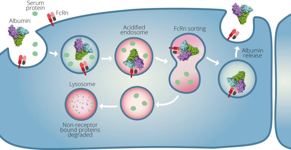 Figure: The neonatal Fc receptor (FcRn)-driven endosomal sorting pathway for cellular recycling of albumin. Figure prepared by Julie Schmøkel.