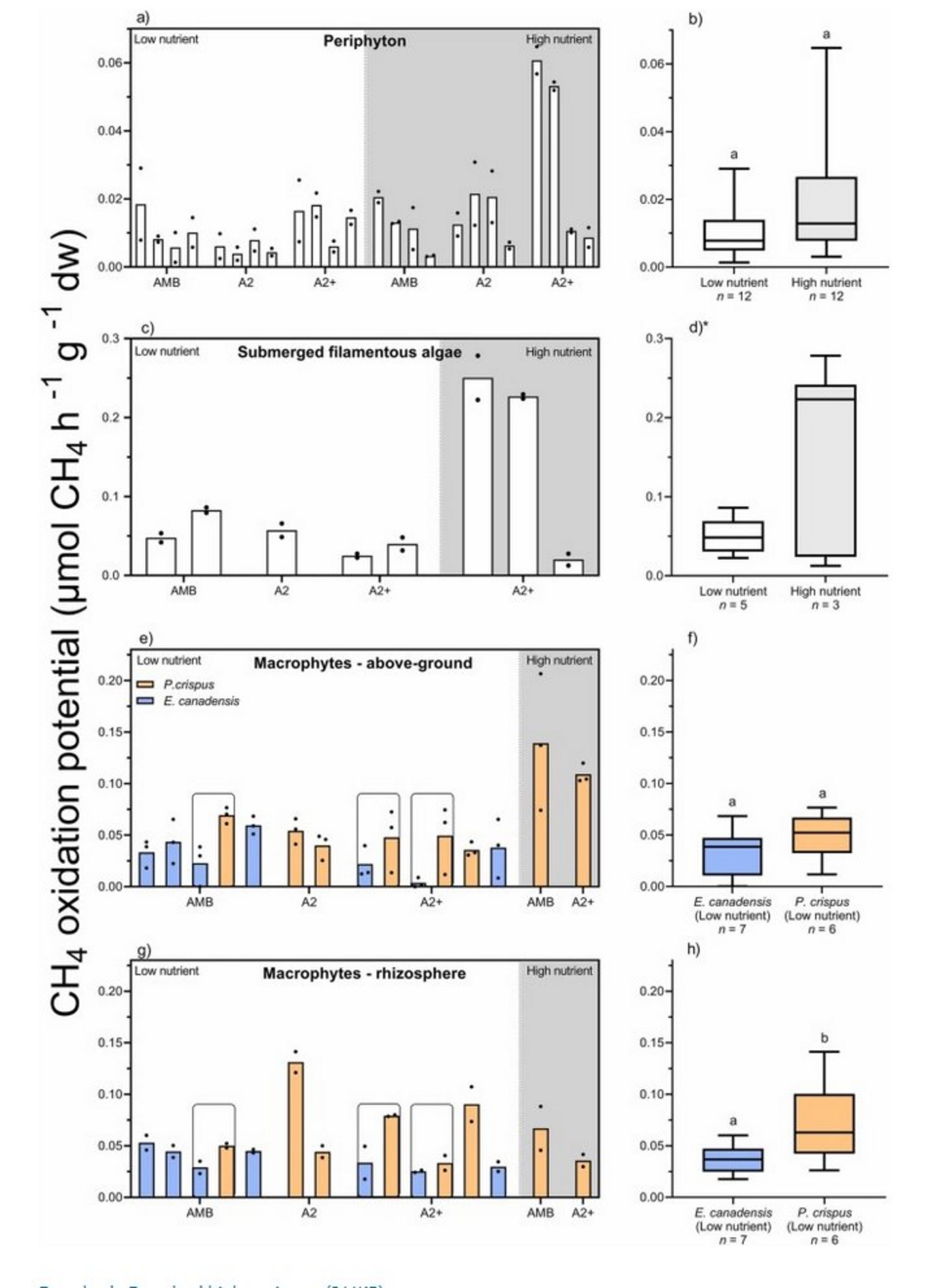 Shallow lakes produce and emit substantial amounts of methane (CH4). Part of the CH4 produced in lakes is consumed by methane-oxidizing bacteria (MOB) present in the sediment and water column, thus reducing the overall CH4 emissions. However, the role of aquatic plants as habitat for CH4 oxidation by MOB is poorly understood. In this study, we compared CH4 oxidation rates and MOB abundance associated with different types of aquatic plants (periphyton, filamentous algae, and both above-ground macrophytes and their rhizosphere). The plants were collected from shallow lake mesocosms exposed to experimental nutrient enrichment and warming treatments for 17 years prior to this study. Incubations of all sampled plants showed CH4 oxidation, with above-ground macrophyte tissue and filamentous algae having the highest rates of up to 0.25 µmol CH4 h−1 g−1 dw. Oxidation rates associated with macrophytes were species dependent, with consumption rates on rhizospheres of Potamogeton crispus higher than those on Elodea canadensis. The increase in nutrients and dissolved CH4 in the water tended to increase MOB abundance and activity for all plant types, while no effect of long term warming was detectable. Our results showed that MOB associated with periphyton, filamentous algae and macrophytes oxidize CH4 in shallow lakes at different rates across species or plant types. We also found that high macrophyte biomass is associated with reduced CH4 concentration in the water. This study shows that CH4 oxidation occurs on many plant surfaces but that oxidation rates alone cannot explain the reduced CH4 emissions at higher plant biomass.