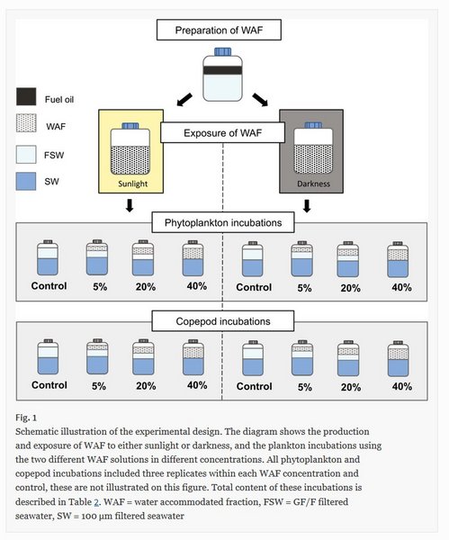 Arctic shipping and oil exploration are expected to increase, as sea ice extent is reduced. This enhances the risk for accidental oil spills throughout the Arctic, which emphasises the need to quantify potential consequences to the marine ecosystem and to evaluate risk and choose appropriate remediation methods. This study investigated the sensitivity of Arctic marine plankton to the water accommodated fraction (WAF) of heavy fuel oil. Arctic marine phytoplankton and copepods (Calanus finmarchicus) were exposed to three WAF concentrations corresponding to total hydrocarbon contents of 0.07 mg l-1, 0.28 mg l-1 and 0.55 mg l-1. Additionally, the potential phototoxic effects of exposing the WAF to sunlight, including the UV spectrum, were tested. The study determined sub-lethal effects of WAF exposure on rates of key ecosystem processes: primary production of phytoplankton and grazing (faecal pellet production) of copepods. Both phytoplankton and copepods responded negatively to WAF exposure. Biomass specific primary production was reduced by 6, 52 and 73% and faecal pellet production by 18, 51 and 86% with increasing WAF concentrations compared to controls. The phototoxic effect reduced primary production in the two highest WAF concentration treatments by 71 and 91%, respectively. This experiment contributes to the limited knowledge of acute sub-lethal effects of potential oil spills to the Arctic pelagic food web.