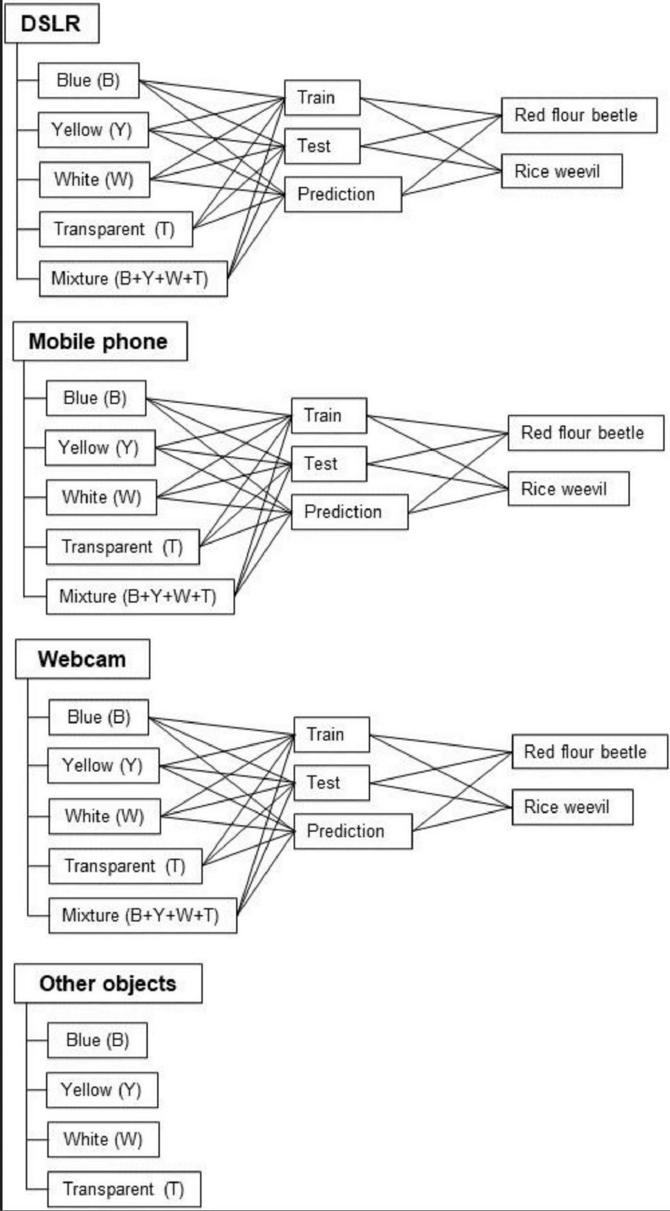 The sticky trap is probably the most cost-effective tool for catching insect pests, but the identification and counting of insects on sticky traps is very labour-intensive. When investigating the automatic identification and counting of pests on sticky traps using computer vision and machine learning, two aspects can strongly influence the performance of the model – the colour of the sticky trap and the device used to capture the images of the pests on the sticky trap. As far as we know, there are no available image datasets to study these two aspects in computer vision and deep learning algorithms. Therefore, this paper presents a new dataset consisting of images of two pests commonly found in post-harvest crops – the red flour beetle (Tribolium castaneum) and the rice weevil (Sitophilus oryzae) – captured with three different devices (DSLR, webcam and smartphone) on blue, yellow, white and transparent sticky traps. The images were sorted by device, colour and species and divided into training, validation and test parts for the development of the deep learning model.