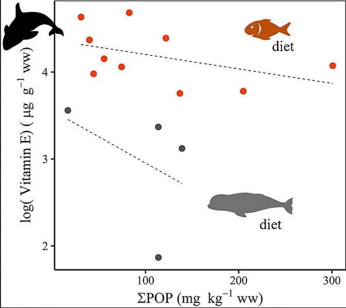 We quantified blubber concentrations of vitamins A (retinol) and E (α-tocopherol) and evaluated associations with persistent organic pollutants (ΣPOPs) in 14 highly-contaminated killer whales (Orcinus orca) sampled in Greenland from 2012 to 2014. We considered the influence of blubber depth, sex/age class and diet (based on biomass % of major fatty acids) in these relationships. Blubber concentrations of vitamin A averaged 34.1 ± 4.7 μg g−1 wet weight (ww) and vitamin E averaged 35.6 ± 4.4 μg g−1 ww. Although overall vitamin A concentrations did not vary between inner (closer to the muscle) and outer (closer to the skin) blubber layer or between sub-adults and adult females, concentrations in the outer layer of sub-adults were lower compared to the outer layer of adult females (p = 0.03). Outer layer may therefore reflect age accumulation of vitamin A, while in the more active inner layer, age effects might be masked by metabolic needs such as lactation. Neither diet nor ΣPOPs affected vitamin A variation, suggesting this vitamin is highly regulated in the body. Given the high exposures in these killer whales, vitamin A might not be a sensitive biomarker for POPs adverse effects. Vitamin E concentrations were significantly higher in inner compared to outer layer (p < 0.001), likely associated with blubber composition, suggesting that biopsies may not fully represent vitamin E concentrations in blubber. Age-accumulation of vitamin E also occurred with higher concentrations in adult females compared to sub-adults, independent of blubber depth (p < 0.01). Diet, ΣPOPs, and an interaction between these two variables significantly affected vitamin E variation in inner blubber, explaining 91% of this variation. The negative relationship between ΣPOPs (especially Σdichlorodiphenyltrichloroethane (DDT) and Σchlordanes in outer layers) and vitamin E was observed only in killer whales with a diet poorer in polyunsaturated fatty acids, suggested that killer whales feeding more consistently on marine mammals in Arctic environments over a fish-based diet, may be at higher risk of POP-induced disruption in vitamin E homeostasis. Considering diet is therefore important to understand the potential effects of elevated contaminant exposures on levels of certain essential nutrients, i.e., vitamin E, in killer whales.