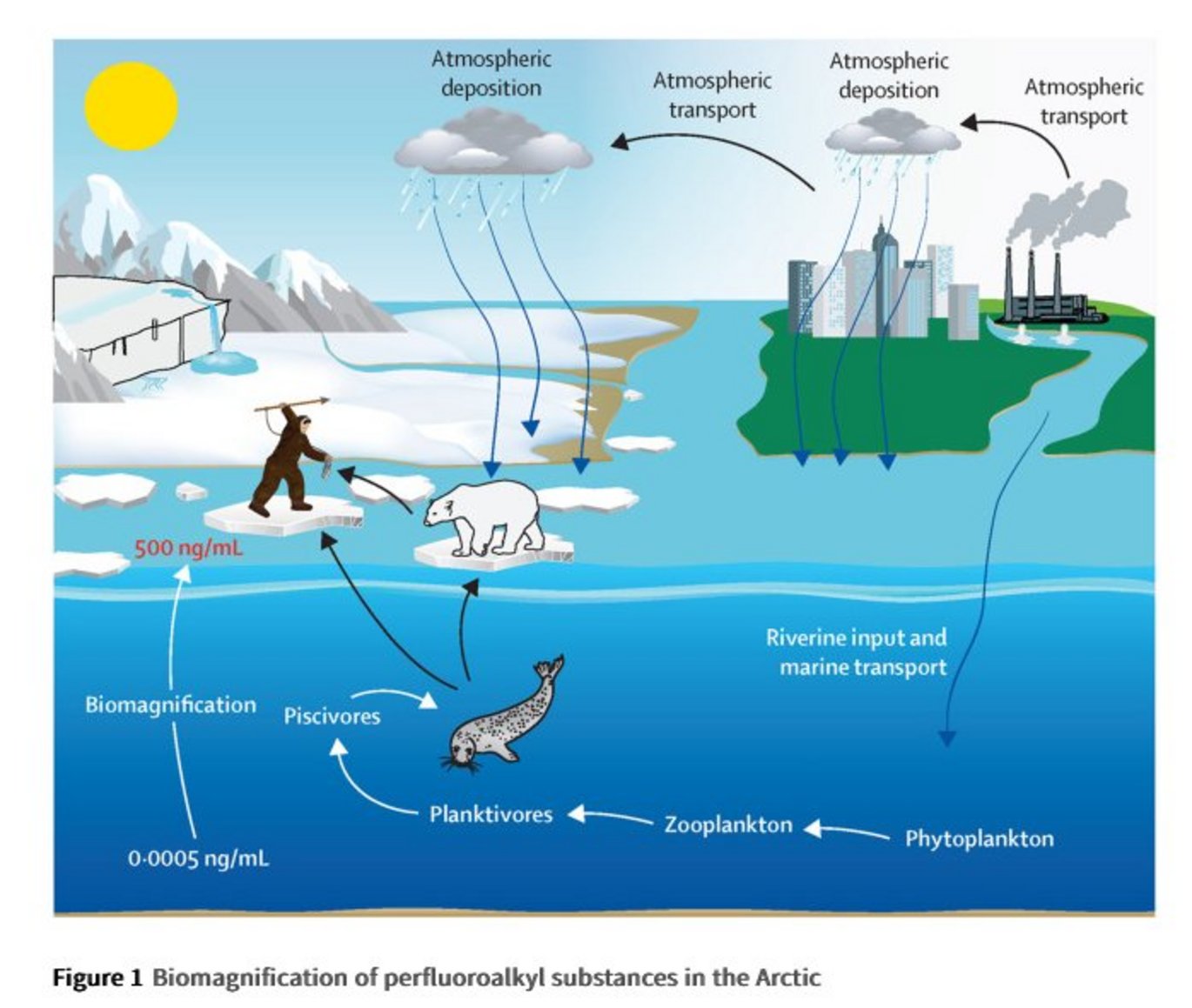 FINDINGS: Between Sept 21, and Oct 2, 2015, 22 participants were enrolled in the study, of which 12 were male and ten were female. Sex data were obtained from personal social security numbers and options were male or female. As a result of a subsistence diet high in marine mammal muscle, 322 (92%) of 350 people in the Ittoqoortoormiit cohort exceeded the established immunotoxic thresholds of ∑4PFASs set by EFSA's tolerable weekly intake of 4·4 ng/kg, and 301 (86%) were in the most severe risk category (>31·9 ng/mL) based on blood serum concentrations. This Inuit cohort had the highest non-occupational long-term exposure to PFASs worldwide despite their remote location relative to industrial sources. Using country-wide average values across global studies, we found that blood serum concentrations of PFASs in populations from European countries, North America, the Arctic, and Australia were generally higher than those in South America, Africa, and mainland Asia, with the highest concentrations found in people from USA, Canada, Greenland, Faroe Islands, Denmark, Iceland, Norway, Sweden, the UK, Spain, Poland, and Australia. These high exposure countries all fall within the EFSA moderate-risk and high-risk categories.