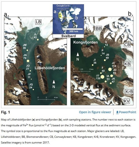 Benthic iron (Fe) fluxes from continental shelf sediments are an important source of Fe to the global ocean, yet the magnitude of these fluxes is not well constrained. Processing of Fe in sediments is of particular importance in the Arctic Ocean, which has a large shelf area and Fe limitation of primary productivity. In the Arctic fjords of Svalbard, glacial weathering delivers high volumes of Fe-rich sediment to the fjord benthos. Benthic redox cycling of Fe proceeds through multiple pathways of reduction (i.e., dissimilatory iron reduction and reduction by hydrogen sulfide) and re-oxidation. There are few estimates of the magnitude and controlling factors of the benthic Fe flux in Arctic fjords. We collected cores from two Svalbard fjords (Kongsfjorden and Lilliehöökfjorden), measured dissolved Fe2+ concentrations using a two-dimensional sensor, and analyzed iron, manganese, carbon, and sulfur species to study benthic Fe fluxes. Benthic fluxes of Fe2+ vary throughout the fjords, with a “sweet spot” mid-fjord controlled by the availability of organic carbon linked to sedimentation rates. The flux is also impacted by fjord circulation and sea ice cover, which influence overall mineralization rates in the sediment. Due to ongoing Arctic warming, we predict an increase in the benthic Fe2+ flux with reduced sea ice cover in some fjords and a decrease in the Fe2+ flux with the retreat of tidewater glaciers in other regions. Decreasing benthic Fe2+ fluxes in fjords may exacerbate Fe limitation of primary productivity in the Arctic Ocean.