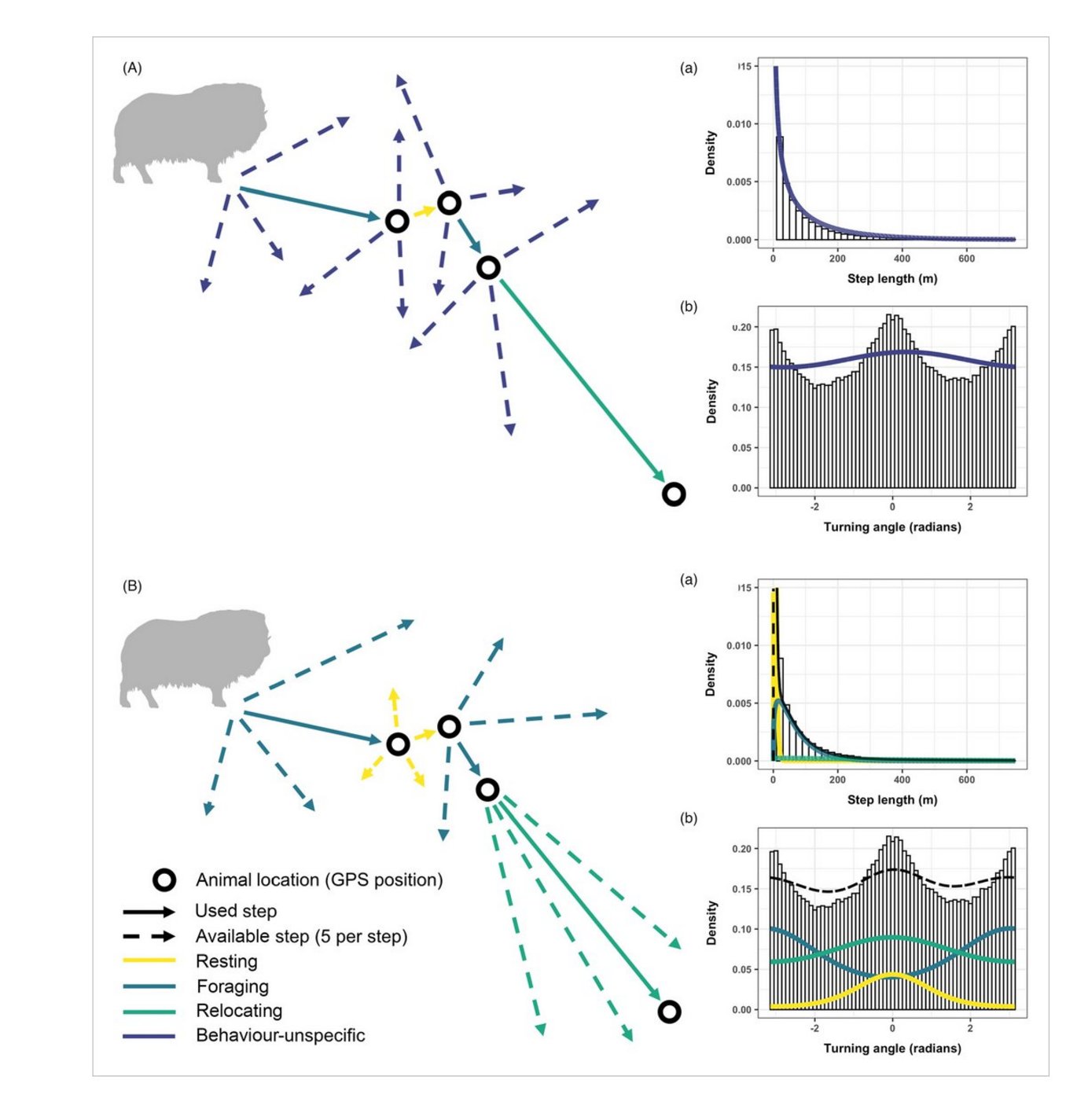 - Using a predator-free population of high-arctic muskoxen Ovibos moschatus as a case study, we aimed to evaluate how (1) defining behaviour-specific availability domains, and/or (2) fitting separate behaviour-specific models impacts (a) model structure, (b) estimated selection coefficients and (c) model predictive performance as opposed to behaviour-unspecific approaches. To do so, we first applied hidden Markov models to infer different behavioural modes (resting, foraging, relocating) from hourly GPS positions (19 individuals, 153–1062 observation days/animal). Using SSFs, we then compared behaviour-specific versus behaviour-unspecific habitat selection in relation to terrain features, vegetation and snow conditions.