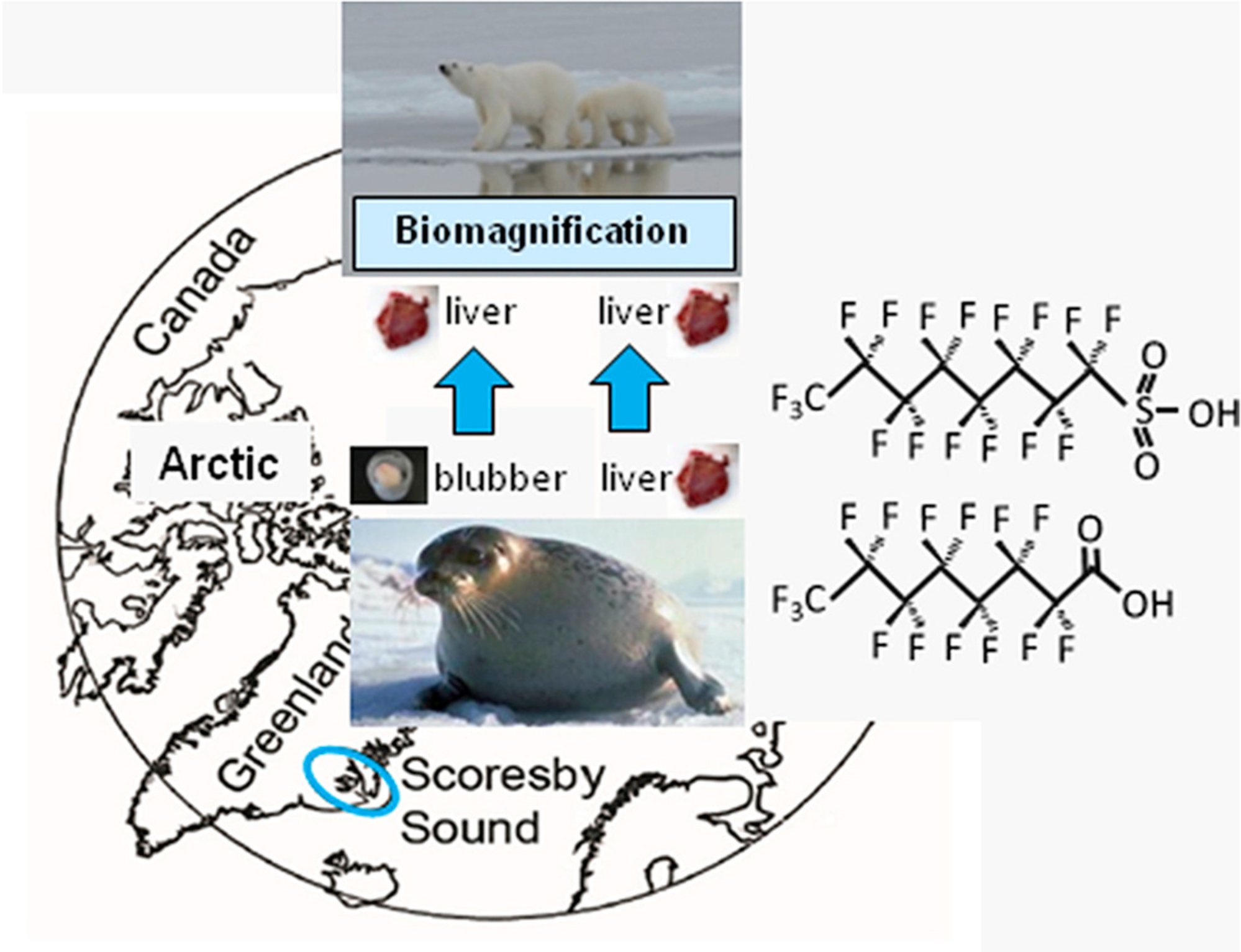 The bioaccumulation and biomagnification of 22 major perfluoroalkyl substances (PFAS) were investigated in tissues of polar bears (Ursus maritimus) and their major prey species, the ringed seal (Pusa hispida), from the Scoresby Sound region of East Greenland. In polar bear liver the mean Σ4PFSA (perfluoroalkyl sulfonic acid) concentration (C4, C6, C8 and C10) was 2611 ± 202 ng/g wet weight (ww; 99% perfluorooctane sulfonate (PFOS)) and two orders of magnitude higher than the 20 ± 3 ng/g ww (89% PFOS) concentration in fat. The mean Σ4PFSAs in seal liver was 111 ± 5 ng/g ww (98% PFOS) and three orders of magnitude higher relative to the 0.05 ± 0.01 ng/g ww concentration in blubber (100% perfluorohexane sulfonate). Perfluoro-1-octane sulfonamide (FOSA) was quantifiable in bear (mean 10 ± 1.4 ng/g ww) and seal (mean 0.6 ± 0.1 ng/g ww) liver but not in fat or blubber. The mean Σ13PFCAs (C4–C18; perfluoroalkyl carboxylic acids) in bear liver (924 ± 71 ng/g ww) was much greater than in seal liver (74 ± 6 ng/g ww). In bear fat and seal blubber, the mean Σ13PFCAs were 15 ± 1.9 and 0.9 ± 0.1 ng/g ww, respectively. Longer chain C11 to C14 PFCAs dominated in bear fat and seal blubber (60–80% of Σ13PFCA), whereas shorter-chain C9 to C11 PFCAs dominated in the liver (85–90% of Σ13PFCA). Biomagnification factors (BMFs) were orders of magnitude greater for PFHxS and C9 to C13 PFCAs when based on bear liver to seal blubber rather than bear liver to seal liver, and PFCA (C9 to C13) BMFs decreased with increasing chain length. Seal blubber to bear liver BMFs better reflects the dietary exposure relationship of PFAS between bears and seals.