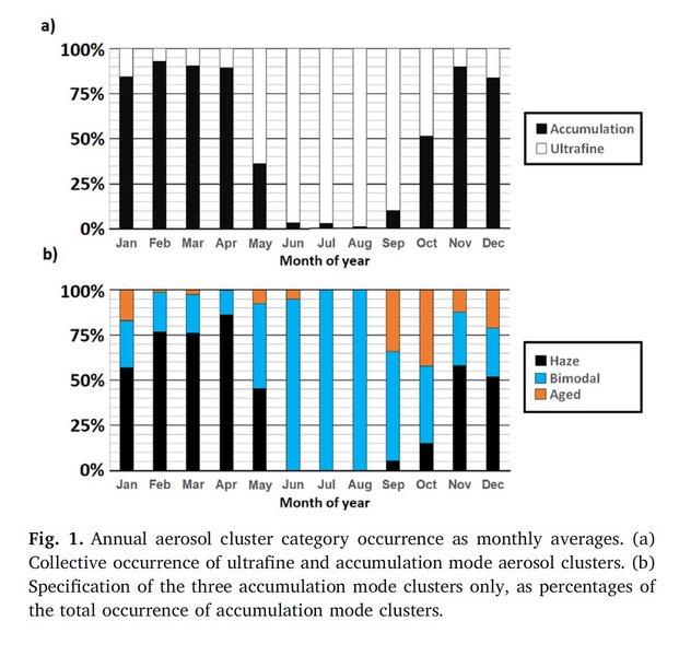 In this work we use cluster analysis of long term particle size distribution data to expand an array of different shorter term atmospheric measurements, thereby gaining insights into longer term patterns and properties of Arctic aerosol. Measurements of aerosol number size distributions (9–915 nm) were conducted at Villum Research Station (VRS), Station Nord in North Greenland during a 5 year record (2012–2016). Alongside this, measurements of aerosol composition, meteorological parameters, gaseous compounds and cloud condensation nuclei (CCN) activity were performed during different shorter occasions. K-means clustering analysis of particle number size distributions on daily basis identified several clusters. Clusters of accumulation mode aerosols (main size modes > 100 nm) accounted for 56% of the total aerosol during the sampling period (89–91% during February–April, 1–3% during June–August). By association to chemical composition, cloud condensation nuclei properties, and meteorological variables, three typical accumulation mode aerosol clusters were identified: Haze (32% of the time), Bimodal (14%) and Aged (6%). In brief: (1) Haze accumulation mode aerosol shows a single mode at 150 nm, peaking in February–April, with highest loadings of sulfate and black carbon concentrations. (2) Accumulation mode Bimodal aerosol shows two modes, at 38 nm and 150 nm, peaking in June–August, with the highest ratio of organics to sulfate concentrations. (3) Aged accumulation mode aerosol shows a single mode at 213 nm, peaking in September–October and is associated with cloudy and humid weather conditions during autumn. The three aerosol clusters were considered alongside CCN concentrations. We suggest that organic compounds, that are likely marine biogenic in nature, greatly influence the Bimodal cluster and contribute significantly to its CCN activity. This stresses the importance of better characterizing the marine ecosystem and the aerosol-mediated climate effects in the Arctic.