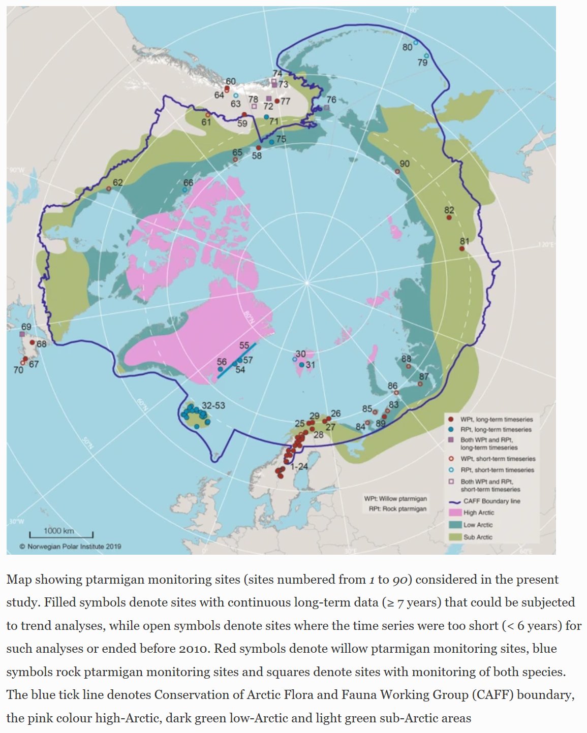 Rock ptarmigan (Lagopus muta) and willow ptarmigan (L. lagopus) are Arctic birds with a circumpolar distribution but there is limited knowledge about their status and trends across their circumpolar distribution. Here, we compiled information from 90 ptarmigan study sites from 7 Arctic countries, where almost half of the sites are still monitored. Rock ptarmigan showed an overall negative trend on Iceland and Greenland, while Svalbard and Newfoundland had positive trends, and no significant trends in Alaska. For willow ptarmigan, there was a negative trend in mid-Sweden and eastern Russia, while northern Fennoscandia, North America and Newfoundland had no significant trends. Both species displayed some periods with population cycles (short 3–6 years and long 9–12 years), but cyclicity changed through time for both species. We propose that simple, cost-efficient systematic surveys that capture the main feature of ptarmigan population dynamics can form the basis for citizen science efforts in order to fill knowledge gaps for the many regions that lack systematic ptarmigan monitoring programs.