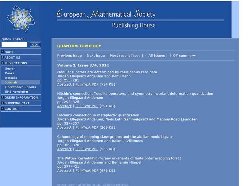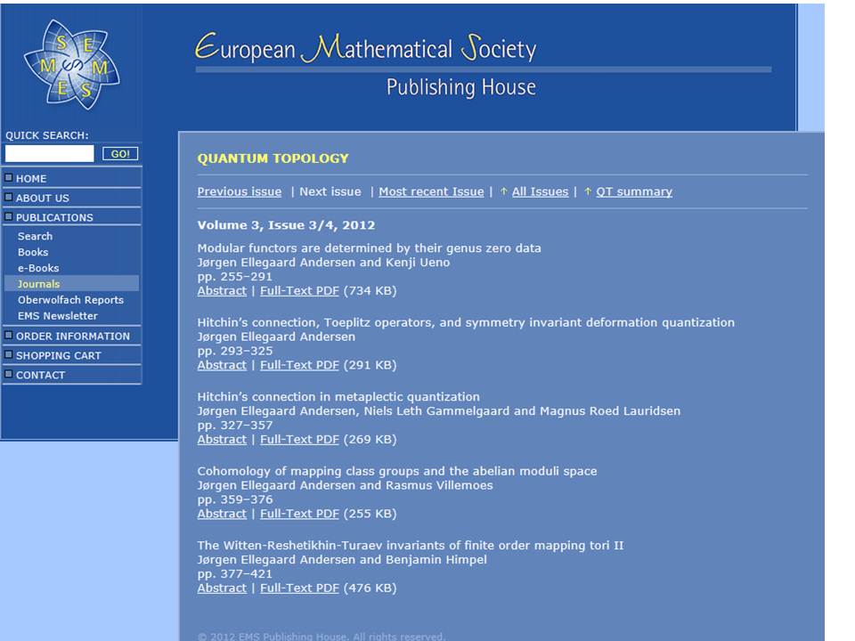 A double issue of Quantum Topology (vol. 3, issue 3/4, 2012) is dedicated entirely to QGM Center Director Jørgen Ellegaard Andersen's work partly joint with other QGM researchers. Quantum Topology is a top journal within QGM's research field and has never before published more than one article by the same author in one issue.
