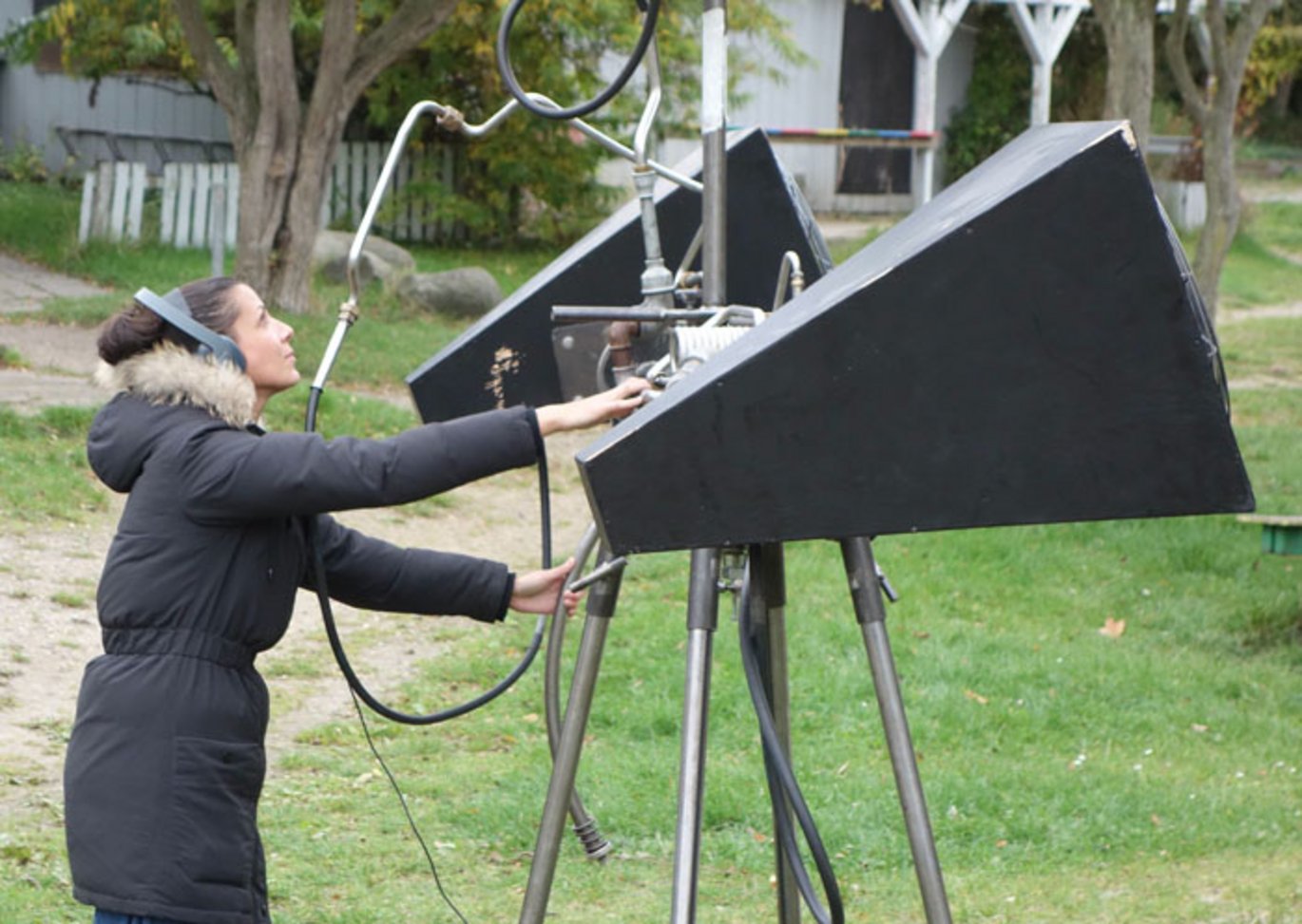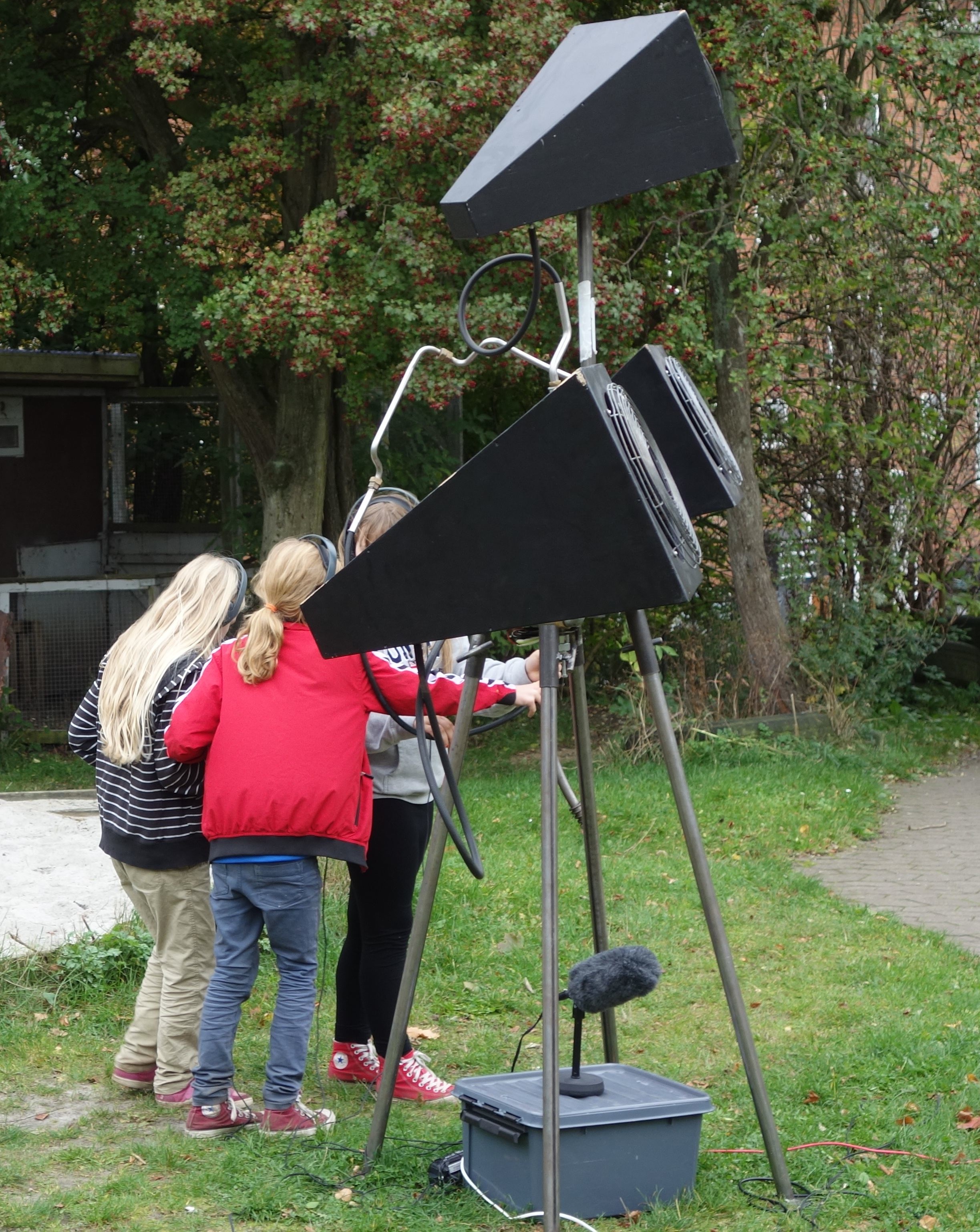 In March of 2012, Aarhus residents had the opportunity to hear “echoes” of 18th century Aarhus by navigating with Ekkomaten. The installation reappeared on Friday, October 11th, this time in the neighborhood of Møllevangen, with a sound archive reflecting the local soundscape. Throughout the past year, the project participants and area residents worked on the sound archive to create a new version of Ekkomaten. Sound recorders were distributed to area residents, who were asked to capture the sounds of their neighborhood. As a result, the archive contained sounds that the residents liked or disliked, such as the sounds of a helicopter, playground, or doorbells, as well as allegorical sounds, everyday sounds, and interviews with area residents. In this way, people could navigate and listen to the sounds of their neighborhood by pointing Ekkomaten at the sources of the sounds. An extra layer, consisting of random interviews or stories told by the area residents, overlay the sound archive.
