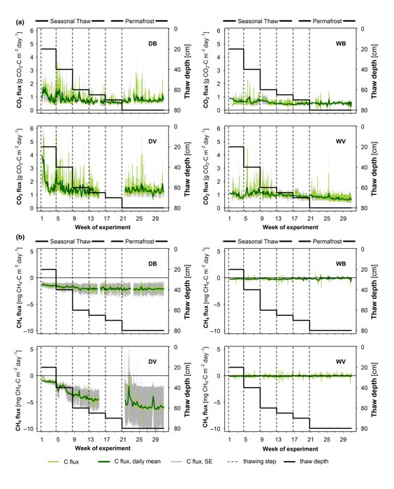 Permafrost peatlands are biogeochemical hot spots in the Arctic as they store vast amounts of carbon. Permafrost thaw could release part of these long‐term immobile carbon stocks as the greenhouse gases (GHGs) carbon dioxide (CO2) and methane (CH4) to the atmosphere, but how much, at which time‐span and as which gaseous carbon species is still highly uncertain. Here we assess the effect of permafrost thaw on GHG dynamics under different moisture and vegetation scenarios in a permafrost peatland. A novel experimental approach using intact plant–soil systems (mesocosms) allowed us to simulate permafrost thaw under near‐natural conditions. We monitored GHG flux dynamics via high‐resolution flow‐through gas measurements, combined with detailed monitoring of soil GHG concentration dynamics, yielding insights into GHG production and consumption potential of individual soil layers. Thawing the upper 10–15 cm of permafrost under dry conditions increased CO2 emissions to the atmosphere (without vegetation: 0.74 ± 0.49 vs. 0.84 ± 0.60 g CO2–C m−2 day−1; with vegetation: 1.20 ± 0.50 vs. 1.32 ± 0.60 g CO2–C m−2 day−1, mean ± SD, pre‐ and post‐thaw, respectively). Radiocarbon dating (14C) of respired CO2, supported by an independent curve‐fitting approach, showed a clear contribution (9%–27%) of old carbon to this enhanced post‐thaw CO2 flux. Elevated concentrations of CO2, CH4, and dissolved organic carbon at depth indicated not just pulse emissions during the thawing process, but sustained decomposition and GHG production from thawed permafrost. Oxidation of CH4 in the peat column, however, prevented CH4 release to the atmosphere. Importantly, we show here that, under dry conditions, peatlands strengthen the permafrost–carbon feedback by adding to the atmospheric CO2 burden post‐thaw. However, as long as the water table remains low, our results reveal a strong CH4 sink capacity in these types of Arctic ecosystems pre‐ and post‐thaw, with the potential to compensate part of the permafrost CO2 losses over longer timescales.