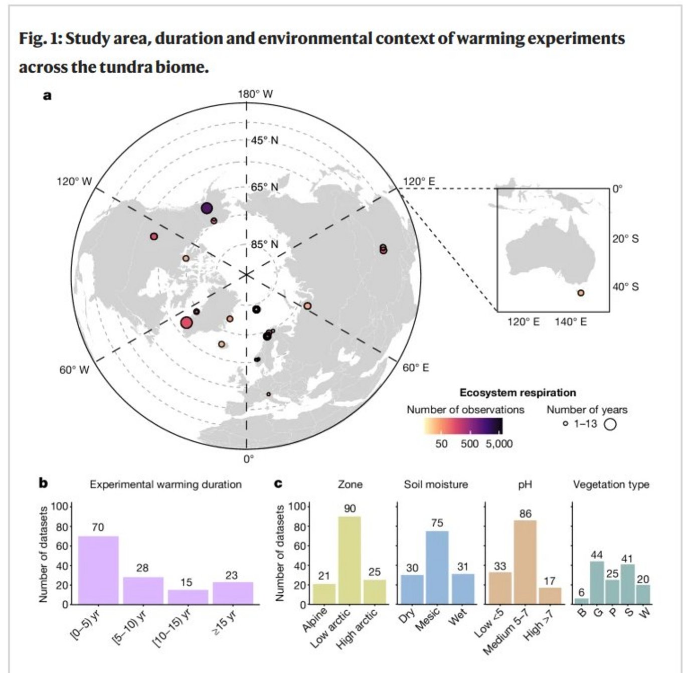 Arctic and alpine tundra ecosystems are large reservoirs of organic carbon1,2. Climate warming may stimulate ecosystem respiration and release carbon into the atmosphere3,4. The magnitude and persistency of this stimulation and the environmental mechanisms that drive its variation remain uncertain5–7. This hampers the accuracy of global land carbon–climate feedback projections7,8. Here we synthesize 136 datasets from 56 open-top chamber in situ warming experiments located at 28 arctic and alpine tundra sites which have been running for less than 1 year up to 25 years. We show that a mean rise of 1.4 °C [confidence interval (CI) 0.9–2.0 °C] in air and 0.4 °C [CI 0.2–0.7 °C] in soil temperature results in an increase in growing season ecosystem respiration by 30% [CI 22–38%] (n = 136). Our findings indicate that the stimulation of ecosystem respiration was due to increases in both plant-related and microbial respiration (n = 9) and continued for at least 25 years (n = 136). The magnitude of the warming effects on respiration was driven by variation in warming-induced changes in local soil conditions, that is, changes in total nitrogen concentration and pH and by context-dependent spatial variation in these conditions, in particular total nitrogen concentration and the carbon:nitrogen ratio. Tundra sites with stronger nitrogen limitations and sites in which warming had stimulated plant and microbial nutrient turnover seemed particularly sensitive in their respiration response to warming. The results highlight the importance of local soil conditions and warming-induced changes therein for future climatic impacts on respiration.
