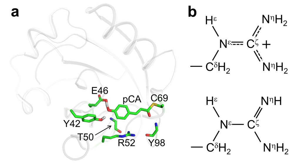 (a) Structure of PYP, showing the active center where a photon is absorbed (b) Chemical structures of the guanidinium (upper) and guanidino (lower) forms of arginine. http://onlinelibrary.wiley.com/doi/10.1002/anie.201609605/abstract