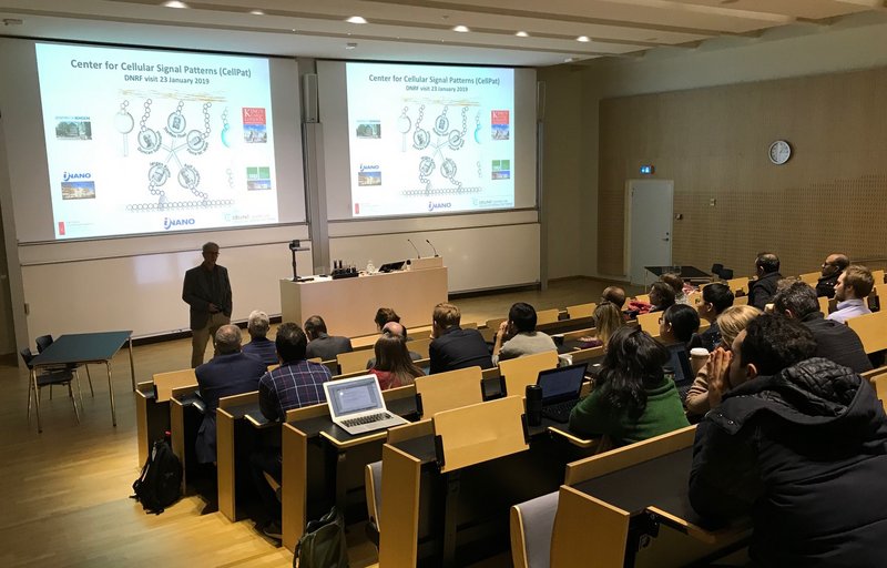 On January 23rd, the Danish National Research Foundation paid their first annual visit to CellPAT. The three DNRF committee members were given an overview of current activities in the center, both from the PIs running the CellPAT labs and from PhD students Colin Mothershead and Kasper Okholm. In addition, there was a general discussion on how to establish lab environments that support innovative and out-of-the-box research as well as career advice to master and PhD students. We hope the committee members enjoyed their afternoon at INANO and look forward to welcoming them again next year.