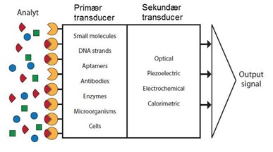 Biosensoren fra Aarhus Universitet består af to såkaldte transducere: en primær og en sekundær (Figur 1). Den primære transducer, der også kaldes for sensormodulet, er ansvarlig for genkendelsen af analytten - det kemiske stof som man er ved at undersøge. Når genkendelsen sker, sker der en signaloverførsel til den sekundære transducer.