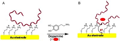 Figur 2. Dopamin biosensor opbygning og aktivering. A. Guld elektrode med selvsamlet monolag af positivt ladet cysteamine molekyler interagerer via elektrostatisk interaktion med den negativt ladet aptamer (vist som rødt bånd) B. Aptamer bundet dopamine overfører elektroner til guldelektroden, hvorefter de detekteres som en strøm.