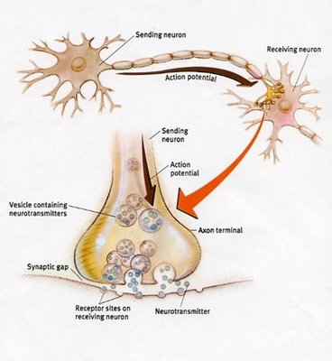 Box 2. Neurotransmittere – er kemiske stoffer, som frigøres i synapser og dermed overfører signal fra et neuron til et andet. Selve signalet der overføres langs neuronet er et elektrokemisk signal, som ikke kan overføres over synapse mellemrummet, der typisk er mellem 20-40 nm. Man kan tænke på neuronet som en kobberledning og synapsen er det sted, hvor ledningen er skåret over. For at sende et signal over synapsen frigives små signalmolekyler, som kan aktivere det modtagende neuron, der videreføre signalet. Signalmolekylerne er neurotransmittere så som dopamine.