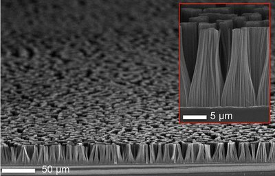 Figur 1: Når det silicium, som er i kontakt med guldmasken, er ætset væk, står der en skov af silicium nanotråde tilbage.