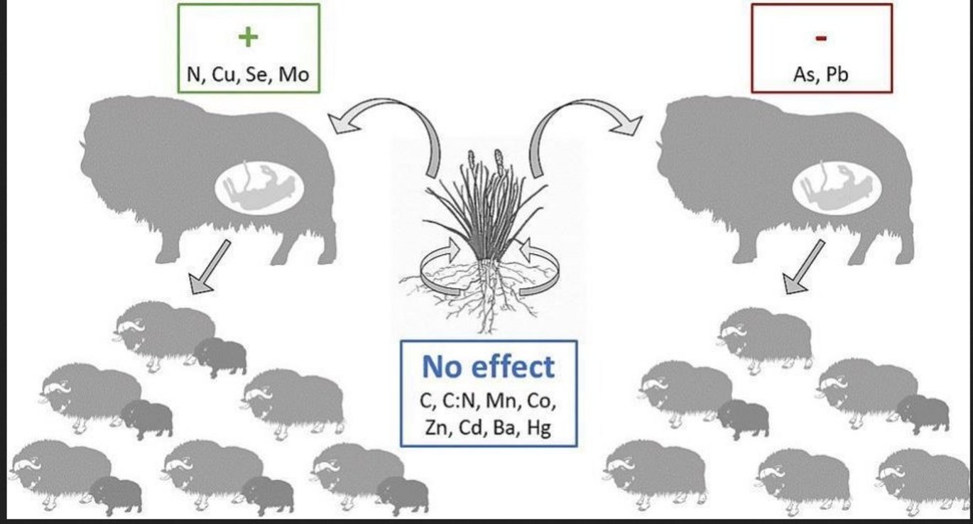 The bioavailability of essential and non-essential elements in vegetation is expected to influence the performance of free-ranging terrestrial herbivores. However, attempts to relate the use of geochemical landscapes by animal populations directly to reproductive output are currently lacking. Here we measured concentrations of 14 essential and non-essential elements in soil and vegetation samples collected in the Zackenberg valley, northeast Greenland, and linked these to environmental conditions to spatially predict and map geochemical landscapes. We then used long-term (1996–2021) survey data of muskoxen (Ovibos moschatus) to quantify annual variation in the relative use of essential and non-essential elements in vegetated sites and their relationship to calf recruitment the following year. Results showed that the relative use of the geochemical landscape by muskoxen varied substantially between years and differed among elements. Selection for vegetated sites with higher levels of the essential elements N, Cu, Se, and Mo was positively linked to annual calf recruitment. In contrast, selection for vegetated sites with higher concentrations of the non-essential elements As and Pb was negatively correlated to annual calf recruitment. Based on the concentrations measured in our study, we found no apparent associations between annual calf recruitment and levels of C, Mn, Co, Zn, Cd, Ba, Hg, and C:N ratio in the vegetation. We conclude that the spatial distribution and access to essential and non-essential elements are important drivers of reproductive output in muskoxen, which may also apply to other wildlife populations. The value of geochemical landscapes to assess habitat-performance relationships is likely to increase under future environmental change.