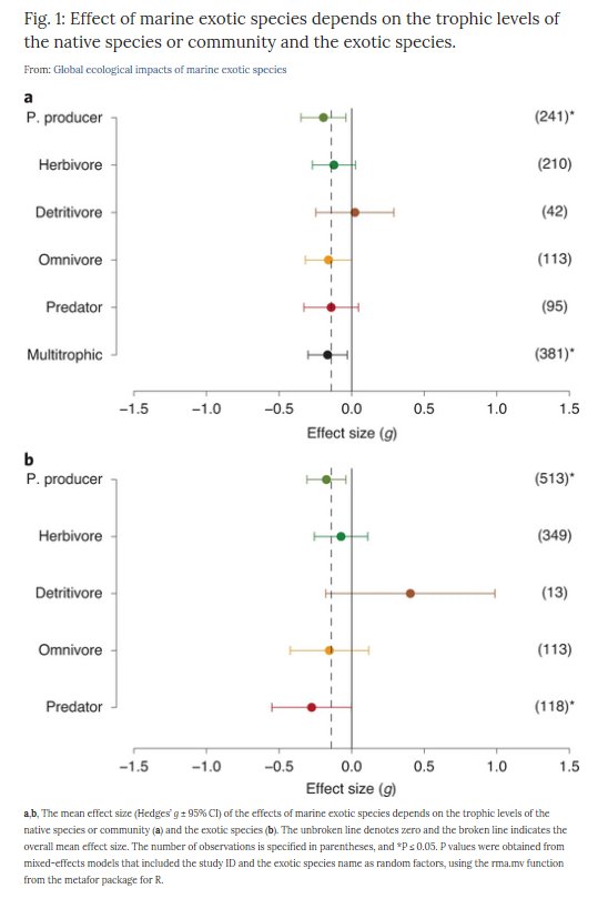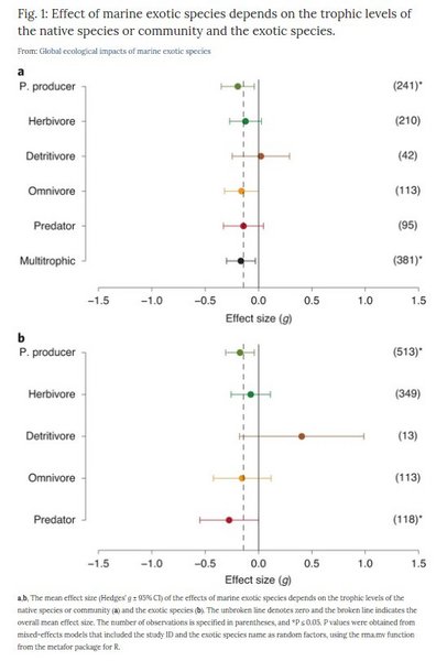 Exotic species are a growing global ecological threat; however, their overall effects are insufficiently understood. While some exotic species are implicated in many species extinctions, others can provide benefits to the recipient communities. Here, we performed a meta-analysis to quantify and synthesize the ecological effects of 76 exotic marine species (about 6% of the listed exotics) on ten variables in marine communities. These species caused an overall significant, but modest in magnitude (as indicated by a mean effect size of g < 0.2), decrease in ecological variables. Marine primary producers and predators were the most disruptive trophic groups of the exotic species. Approximately 10% (that is, 2 out of 19) of the exotic species assessed in at least three independent studies had significant impacts on native species. Separating the innocuous from the disruptive exotic species provides a basis for triage efforts to control the marine exotic species that have the most impact, thereby helping to meet Aichi Biodiversity Target 9 of the Convention on Biological Diversity.