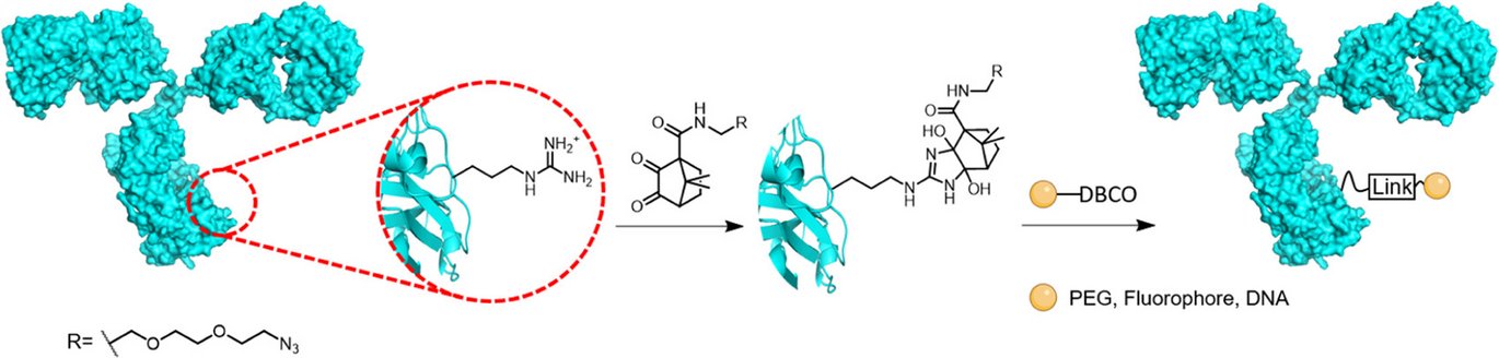 Current bioconjugation methods—techniques used to attach markers to proteins for medical applications—often struggle with precision, as they frequently bind to more common amino acids found all over antibody surfaces. This DKPA-based compound, however, selectively binds to a few arginine residues, which are less common and easier to target for a more uniform result. This innovation could lead to more reliable and consistent antibody-based drugs and diagnostic tools.