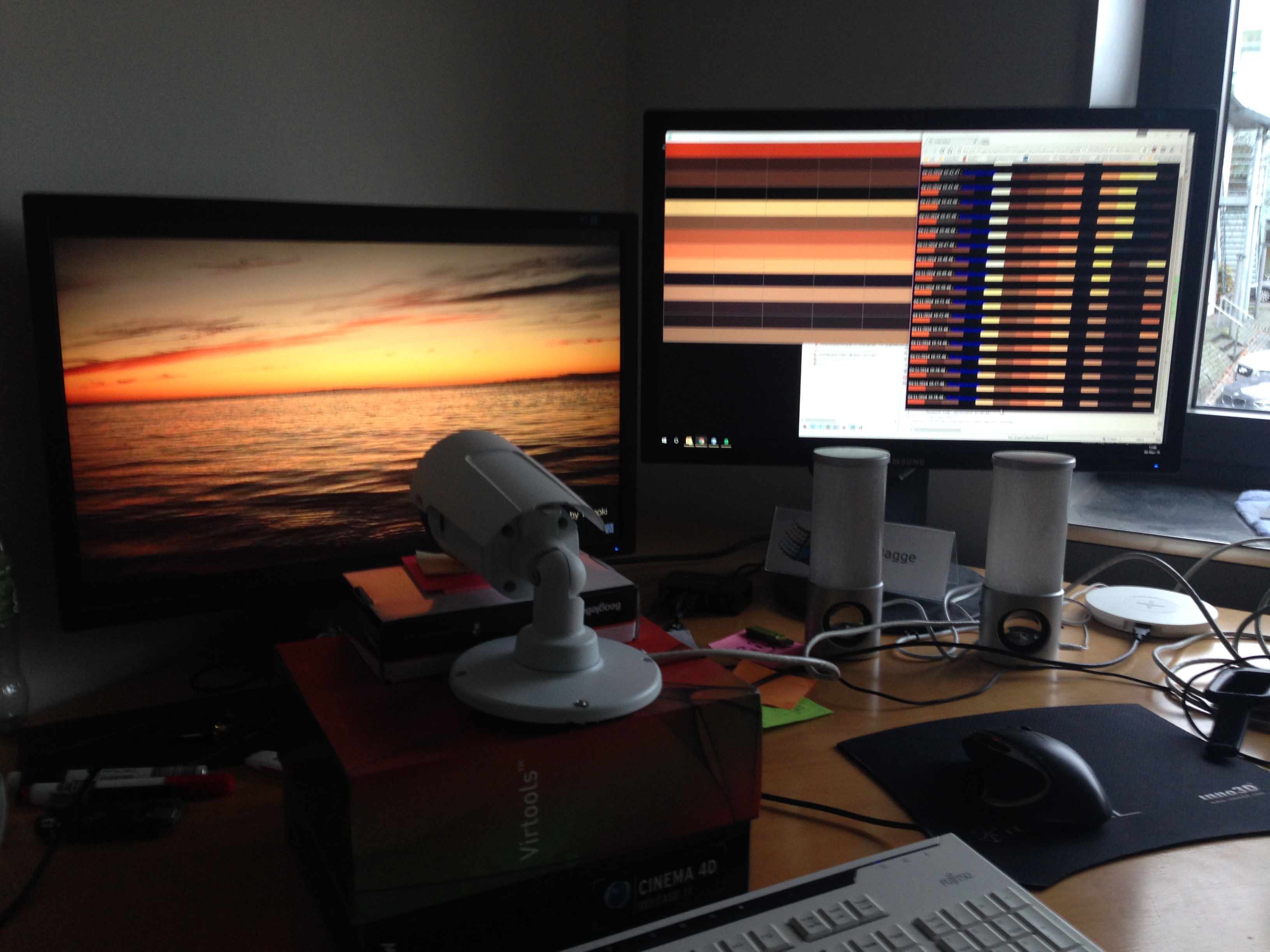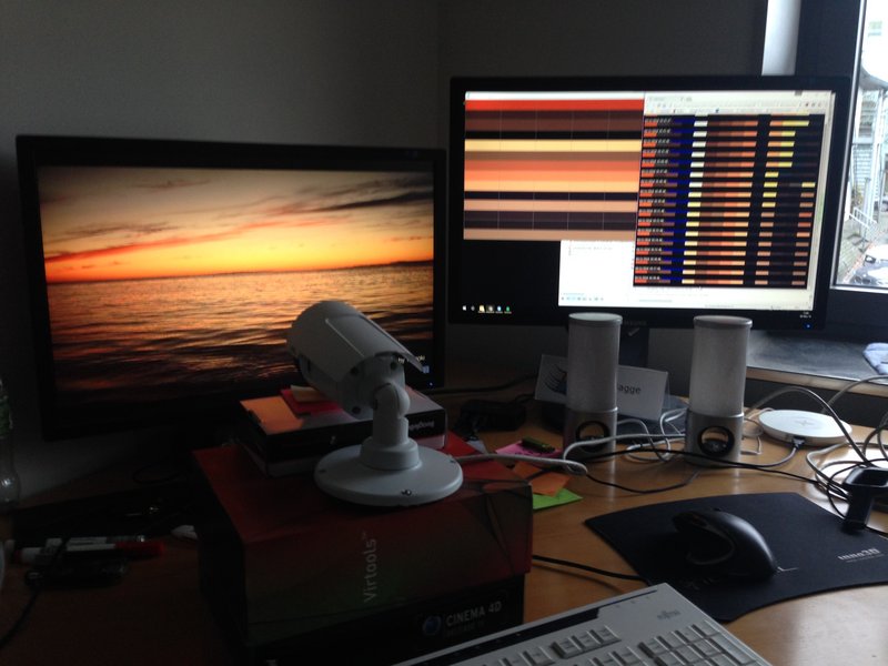 The job for CAVI was to find the technical solution on the artist’s idea of converting the sunset into a light installation on Aarhus Ringgade Bridge. The installation consists of 180 lamps installed onto the bridge. Two cameras record every unique sunset. The recordings are then analysed by an algorithm, and at the time of twilight on the same day the bridge will light up in the set of colours extracted from the given evening’s sunset. The light reflects the sunset dynamically as it replays the progressing colours of the sky. The algorithm defines how the recordings from each sunset are transformed to a unique set of progressing colours. This transformation from recordings to a set of colours is seen on the photo to the left, where the software is tested on a video of a sunset at CAVI.