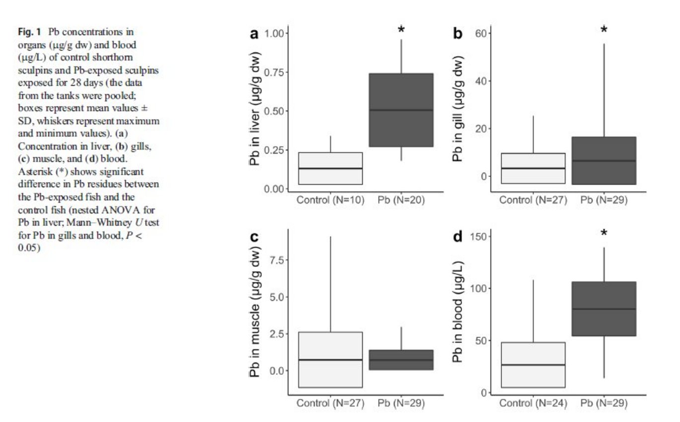 Shorthorn sculpin (Myoxocephalus scorpius) has been used as a sentinel species for environmental monitoring, including heavy metal contamination from mining activities. Former lead–zinc (Pb–Zn) mines in Greenland resulted in elevated concentrations of metals, especially Pb, in marine biota. However, the potential accumulation of Pb and effects of the presence of Pb residues in fish on health of sculpins observed in the field have not been validated in laboratory experiments. Therefore, our aim was to validate field observation of shorthorn sculpin via controlled laboratory exposure to environmentally relevant concentrations of dissolved