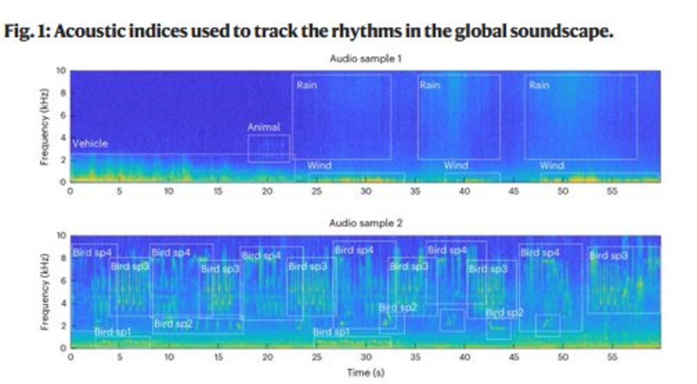 Across the world, human (anthropophonic) sounds add to sounds of biological (biophonic) and geophysical (geophonic) origin, with human contributions including both speech and technophony (sounds of technological devices). To characterize society’s contribution to the global soundscapes, we used passive acoustic recorders at 139 sites across 6 continents, sampling both urban green spaces and nearby pristine sites continuously for 3 years in a paired design. Recordings were characterized by bird species richness and by 14 complementary acoustic indices. By relating each index to seasonal, diurnal, climatic and anthropogenic factors, we show here that latitude, time of day and day of year each predict a substantial proportion of variation in key metrics of biophony—whereas anthropophony (speech and traffic) show less predictable patterns. Compared to pristine sites, the soundscape of urban green spaces is more dominated by technophony and less diverse in terms of acoustic energy across frequencies and time steps, with less instances of quiet. We conclude that the global soundscape is formed from a highly predictable rhythm in biophony, with added noise from geophony and anthropophony. At urban sites, animals experience an increasingly noisy background of sound, which poses challenges to efficient communication.