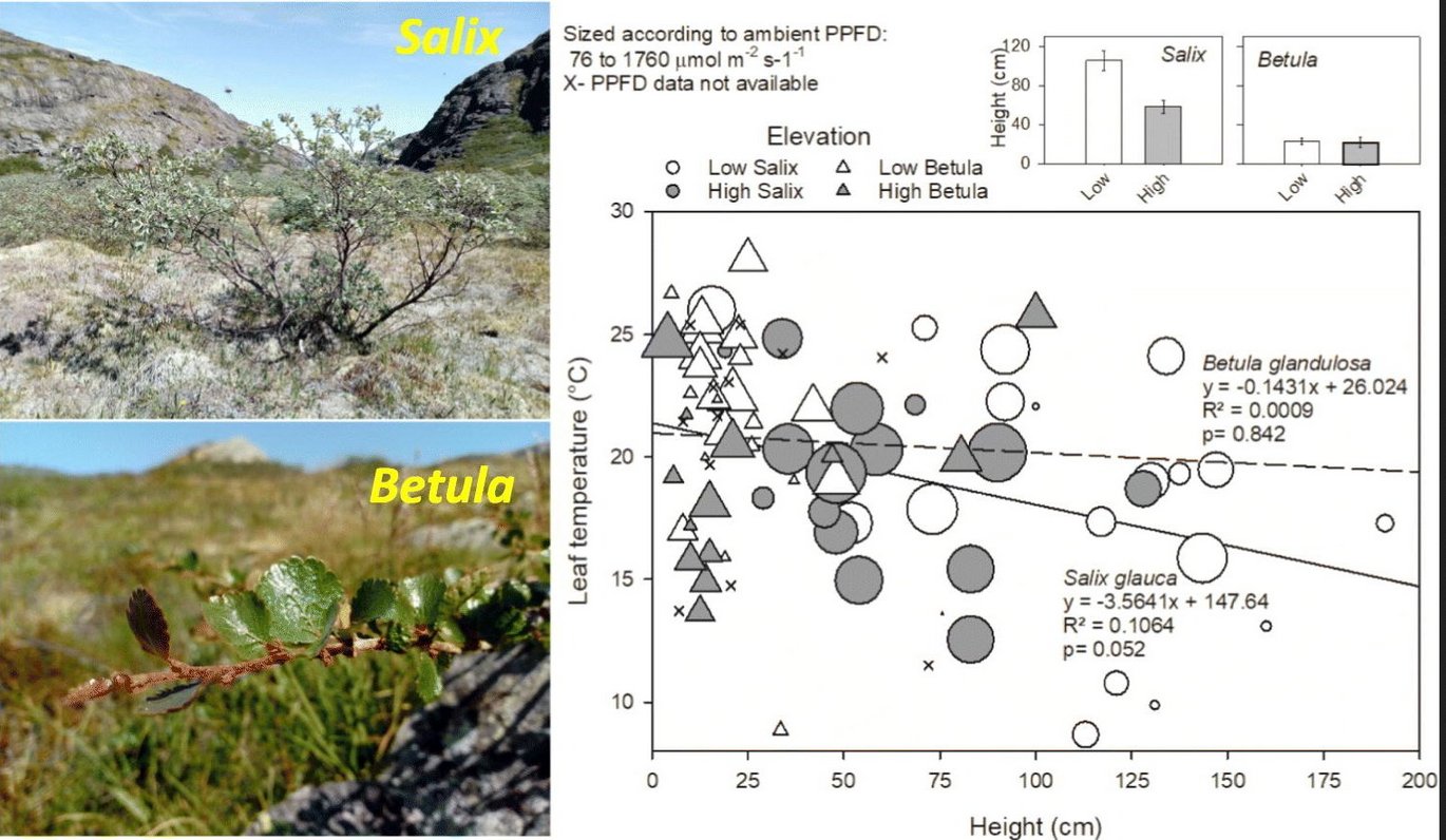 The northernmost regions of our planet experience twice the rate of climate warming compared to the global average. Despite the currently low air temperatures, tundra shrubs are known to exhibit high leaf temperatures and are increasing in height due to warming, but it is unclear how the increase in height will affect the leaf temperature. To study how temperature, soil moisture, and changes in light availability influence the physiology and emissions of climate-relevant volatile organic compounds (VOCs), we conducted a study on two common deciduous tundra shrubs, Salix glauca (separating males and females for potential effects of plant sex) and Betula glandulosa, at two elevations in South Greenland. Low-elevation Salix shrubs were 45% taller, but had 37% lower rates of net CO2 assimilation and 63% lower rates of isoprene emission compared to high-elevation shrubs. Betula shrubs showed 40% higher stomatal conductance and 24% higher glandular trichome density, in the low-elevation valley, compared to those from the high-elevation mountain slope. Betula green leaf volatile emissions were 235% higher at high elevation compared to low elevation. Male Salix showed a distinct VOC blend and emitted 55% more oxygenated VOCs, compared to females, possibly due to plant defense mechanisms. In our light response curves, isoprene emissions increased linearly with light intensity, potentially indicating adaptation to strong light. Leaf temperature decreased with increasing Salix height, at 4 °C m−1, which can have implications for plant physiology. However, no similar relationship was observed for B. glandulosa. Our results highlight that tundra shrub traits and VOC emissions are sensitive to temperature and light, but that local variations in soil moisture strongly interact with temperature and light responses. Our results suggest that effects of climate warming, alone, poorly predict the actual plant responses in tundra vegetation.