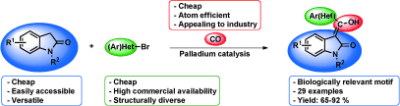In this new paper in Angewandte Chemie International Edition, iNANO scientists report on a new method for accessing functionalized heterocycles, which are privileged structures found in countless natural products and drug candidates. Homogeneous catalysis plays an important role in medicinal chemistry allowing for a direct entry to a wide range of chemical structures under mild reaction conditions and generally with high yields. This is no exception for the new method to prepare 3-acyl-2-oxindoles which are featured in a number of bioactive compounds including GSK3 kinase inhibitors, influenza endonuclease inhibitors, and Tendidap, a potent inhibitor of cyclooxygenase. In particular, the new synthetic strategy allows for the preparation of 3-acyl-2-oxindoles via the Pd-catalysed carbonylation of 2-oxindoles with carbon monoxide and an aryl bromide thereby representing the quickest route to such compounds.