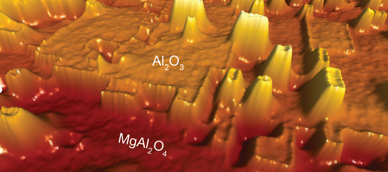 To circumvent the first problem, we use a state of the art microscope, a so-called non-contact atomic force microscope. The biggest strength of this microscope is that we can study both conducting materials like metals but also non-conducting metal oxides like alumina, and these materials can be studied with atomic resolution.