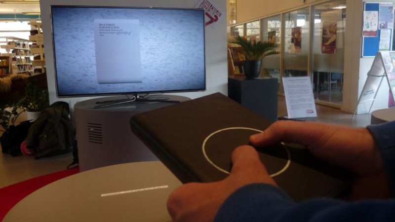 The Ink installation is a collaboration between CAVI, Digital Urban Living, The Roskilde Libraries, and The Public Libraries of Aarhus. The writer, Peter-Clement Woetmann, created the content from which the poems were composed, but the guests took on the challenge of having a crucial say in composing the actual results. The installation consisted of three real books used as tools for interacting with words and sentences floating around on a screen, reluctantly finding their way to a piece of virtual paper, helped by the interacting visitor. Finally, when the poem was complete, the familiar sound of the printer finalized the job.