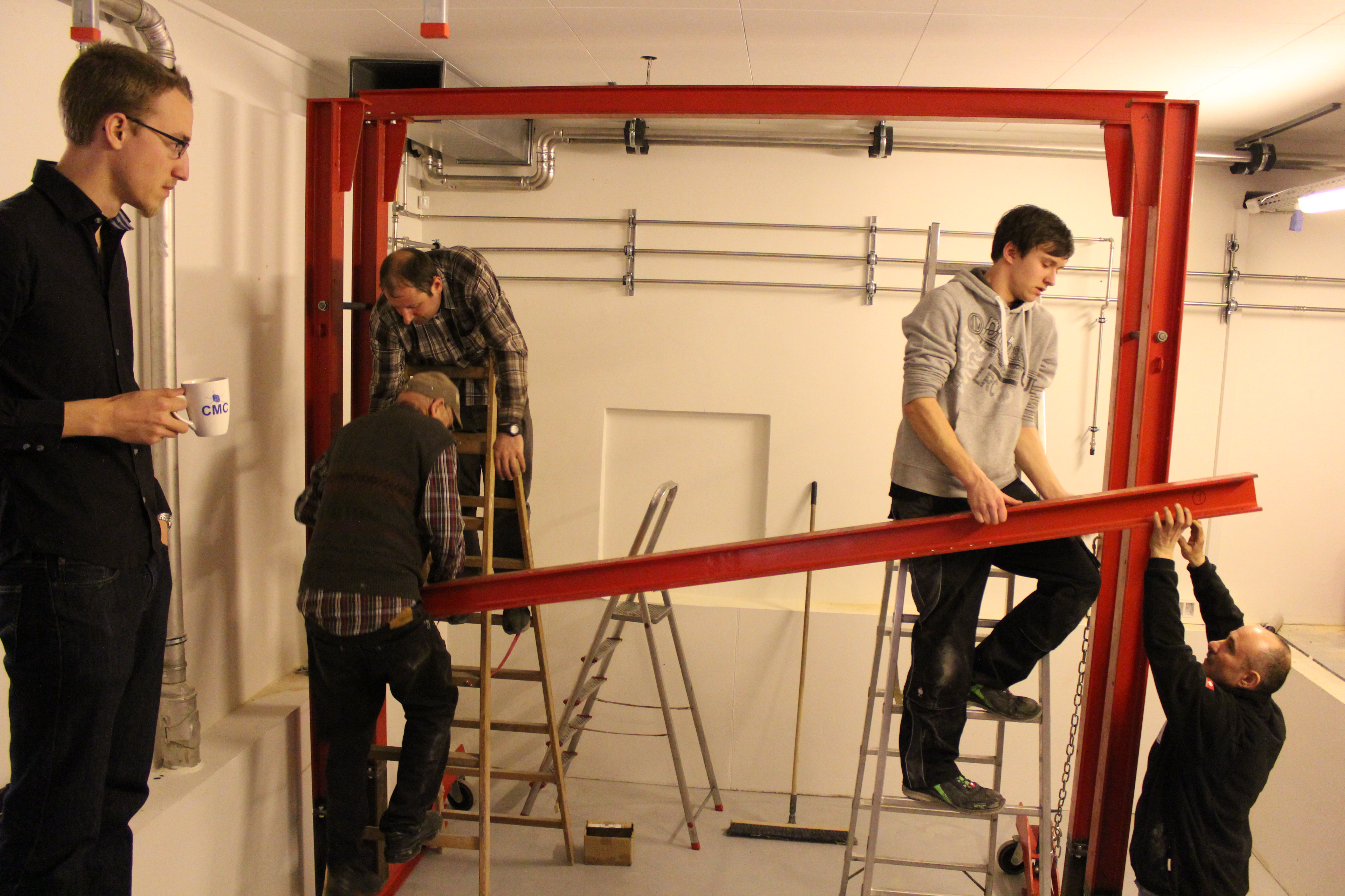Tuesday 9th of April a crew of 4 German technicians began installing the new ultra-high pressure laboratory press which was purchased for CMC by mid-2012. The press is central to the research of CMC ass. prof. Martin Bremholm who will use it, alongside CMC students, for pressure-assisted syntheses of novel materials. The field of high-pressure chemistry is rapidly growing world-wide and will now be fully realized in Denmark for the first time, complementing CMC efforts on high-pressure crystallography by means of Diamond Anvil Cells.