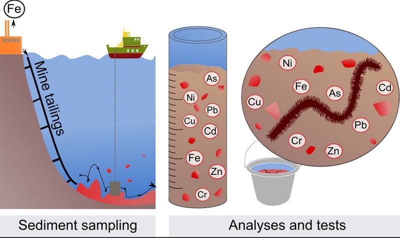 Mine tailings from the iron ore mine Sydvaranger Gruve have been deposited in Bøkfjorden, Northern Norway, for >40 years. This study investigates the environmental impacts of submarine tailings disposal one year after the cessation of the mine by combining analyses of total metal concentrations (nitric acid digestion) and metal fractionation patterns (sequential extraction procedure) of sediments with the metal uptake (bioassays) by sandworms (Alitta virens) exposed to Bøkfjorden sediment. The analyses focused on metals (As, Cd, Cr, Cu, Fe, Ni, Pb, Zn) in sediment cores retrieved from a horizontal transect of the fjord. High concentrations of the target metal iron was found in the fjord (>13,000 mg/kg). According to Norwegian sediment quality guidelines (SQG), cadmium (2.55 mg/kg) and lead (174 mg/kg) were the only metals to exceed good sediment quality at the source area of mine tailings discharge. Despite general low total metal concentrations, labile (summarized exchangeable, acid soluble, reducible fractions) and potentially labile (summarized labile and oxidisable fractions) pools of mine tailings-related metals of cadmium (10–82%), copper (25–88%) and lead (10–67%) were detected while iron were characterized as inert (residual fraction: 89–97%). Despite spatial trends in total metal concentrations presumed to originate from mine tailings (Cd, Cu, Fe, Pb), there were no correlations between total and labile fractions. This can be explained by the high concentrations of iron, which under oxidised forms are suggested to inhibit a high lability of other metals. The metal uptake of sandworms was generally high compared to similar studies and exceeded moderate contamination classes for all metals compared to Norwegian standard values. Both labile metal fractions (cadmium, copper and iron) and total metal concentrations (copper, iron) showed positive correlations (r > 0.6) with metal uptake. Thus, both the total and labile metal fractions can pose an environmental risk.