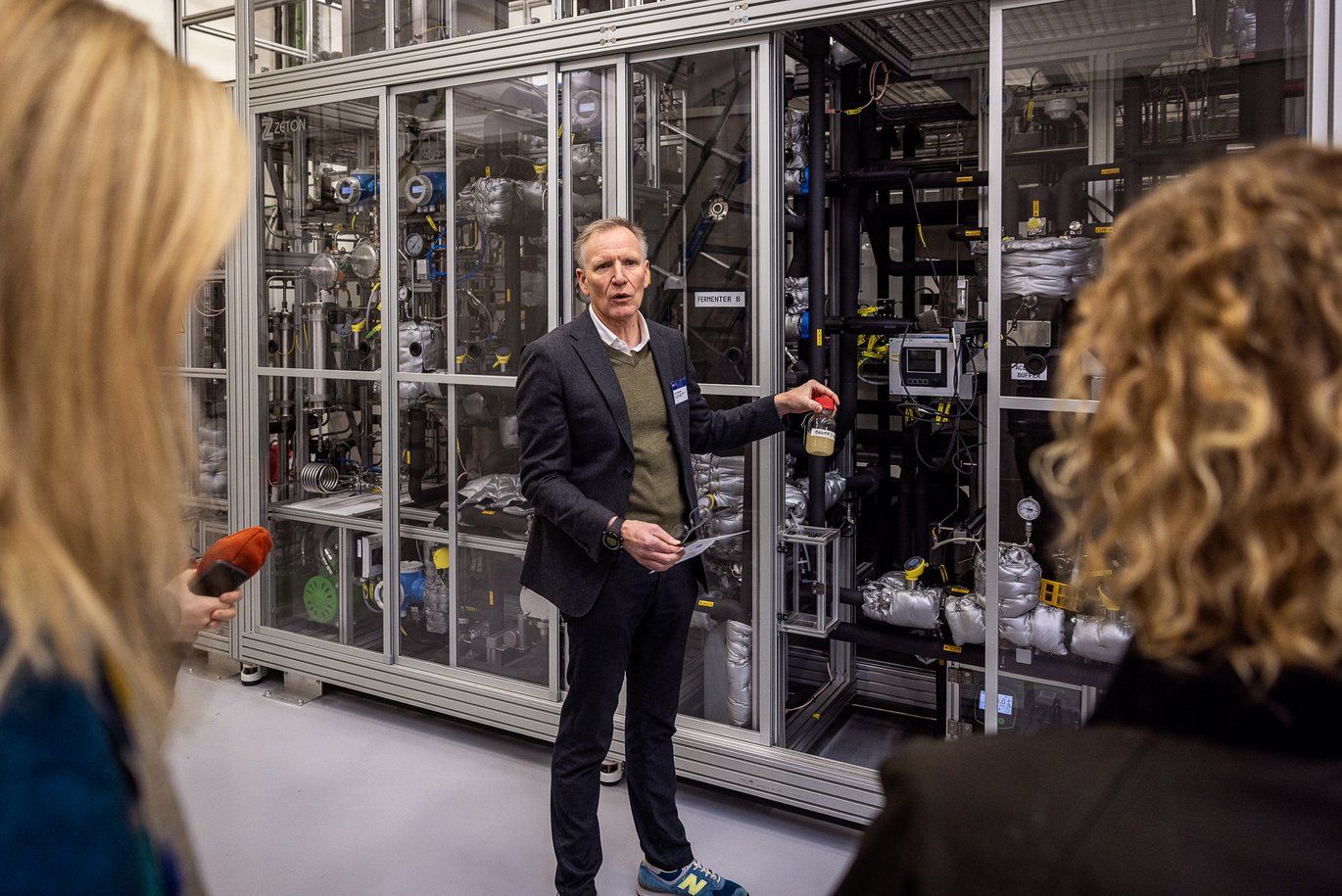 The facility serves as a prototype of a future protein factory. In an oxygen-free reactor, CO₂ and hydrogen are first converted into acetic acid. Then, yeast cells feed on the acid and grow into a protein-rich biomass.