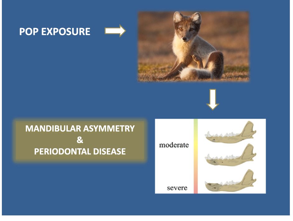 We investigated if dietary exposure to persistent organic pollutants (POPs) affect mandibular asymmetry and periodontal disease in paired male-siblings of Arctic foxes (Vulpes lagopus). During ontogeny, one group of siblings was exposed to the complexed POP mixture in naturally contaminated minke whale (Balaenoptere acutorostarta) blubber (n=10),while another group was given wet feed based on pig (Sus scrofa) fat as a control (n=11). TheΣPOP concentrations were 802 ng/gwwin the whale-based feed compared to 24 ng/gwwin the control diet. We conducted a two-dimensional geometric morphometric (GM) analysis of mandibular shape and asymmetry in the foxes and compared the two groups. The analyses showed that directional asymmetry was higher than fluctuating asymmetry in both groups and that mandibular shape differed significantly between the exposed and control group based on discriminant function analysis (T2 = 58.52, p = 0.04, 1000 permutations). We also found a non-significantly higher incidence of periodontal disease (two-way ANOVA: p = 0.43) and greater severity of sub-canine alveolar bone deterioration similar to periodontitis (two-way ANOVA: p =0.3) in the POP-exposed group. Based on these results, it is possible that dietary exposure to a complexed POP mixture lead to changes in jaw morphology in Arctic foxes. This study suggests that extrinsic factors, such as dietary exposure to POPs, may affect mandibular shape and health in a way that could be harmful to wild Arctic populations. Therefore, further studies using GM analysis as an alternative to traditional morphometric methods should be conducted for wild Arctic fox populations exposed to environmental contaminants.