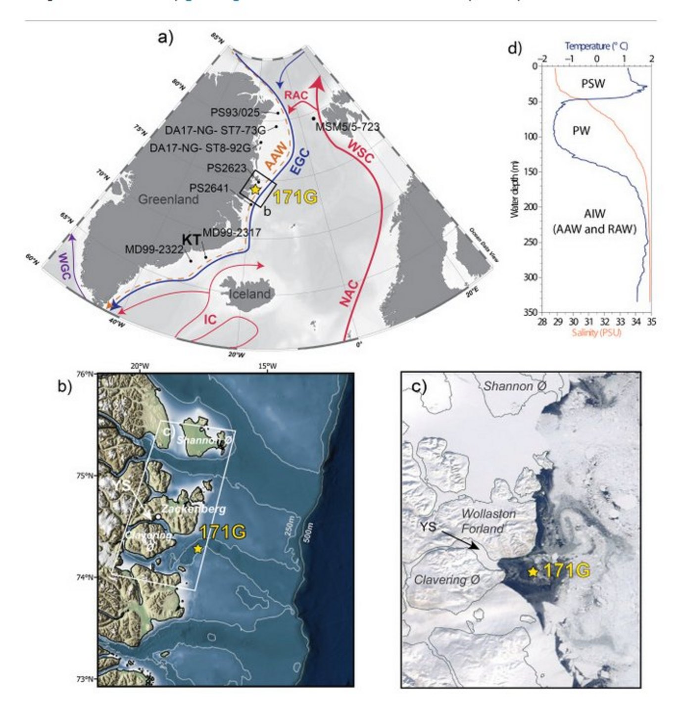 The Fram Strait is one of the largest gateways through which meltwater and sea ice are exported to the subarctic North Atlantic, transiting the North-East Greenland shelf via the southward flowing East Greenland Current. Observations indicate a recent freshening of the East Greenland Current that may have implications for wider oceanic circulation regimes. The North-East Greenland shelf is an opportune region to assess these changes back through time. Paleoceanographic reconstructions from the North-East Greenland shelf are sparse and their temporal coverage is limited to the Holocene, limiting our ability to assess the impact of rapid climatic variations on marine conditions, such as during the Younger Dryas/Holocene transition. Here, we present data from a well-dated marine sediment core retrieved from the North-East Greenland shelf (74°N; east of Young Sound-Tyrolerfjord system) that captures the late Younger Dryas Stadial through to the Mid-Holocene at sub-centennial resolution. We apply a multi-proxy approach to reconstruct changes in productivity, surface and bottom ocean conditions. We show that at 74° N the presence of warm Atlantic waters on the inner North-East Greenland shelf was limited to the late Younger Dryas, as the Greenland Ice Sheet retreated landward and isostatic rebound caused the area to uplift. A unique dimension to this record is its location within one of the few biological hotspots on the East Greenland shelf today; the Sirius Water polynya. Archaeological studies indicate the polynya was forming as early as 4500 years ago, but nothing is known about its evolution from a marine perspective. Cooling of bottom waters, increasing sea-surface productivity and more frequent open water conditions indicate an Early Holocene onset of the Sirius Water (ca. 10–8.7 ka BP).