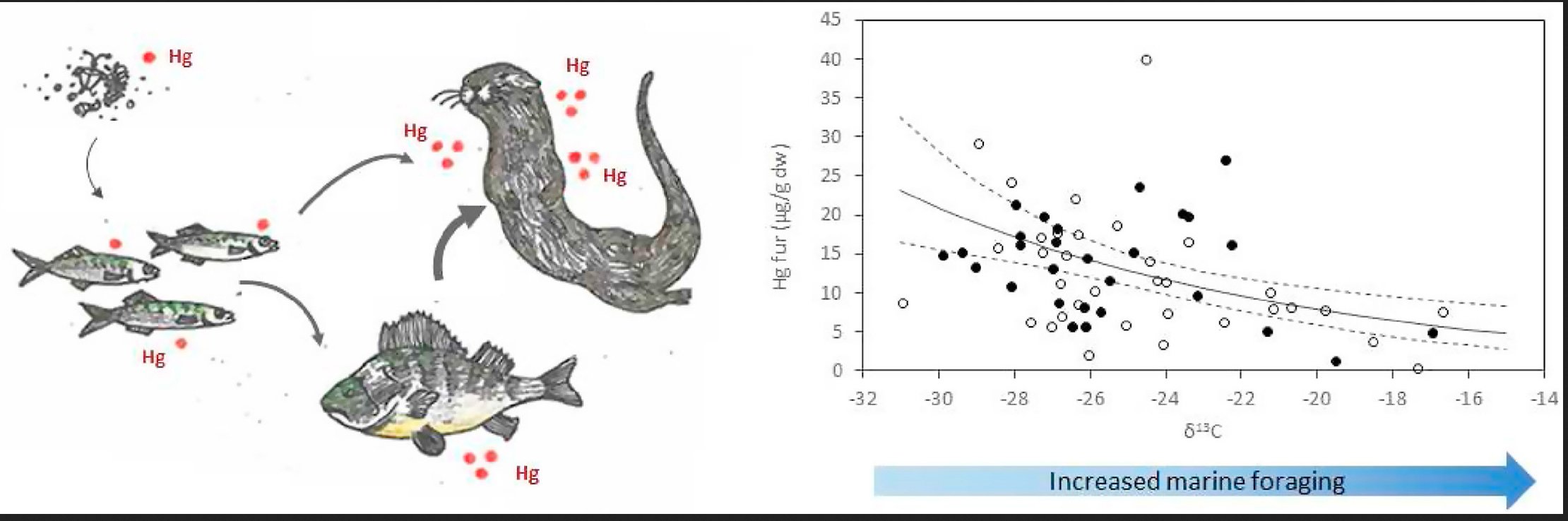 Mercury (Hg) exposure may cause a wide range of adverse effects in mammals. A piscivorous apex predator, as the Eurasian otters (Lutra lutra) may accumulate and biomagnify heavy metals and pollutants. Here we investigate the Hg burden in 117 otters from Denmark to evaluate Hg concentrations and risks of health effects. Mercury concentrations ranged between 0.02 and 10.1 μg/g wet weight (ww) in liver tissue and 0.30–40.0 μg/g dry weight in fur. Concentrations in liver and fur in individual otters were highly correlated (P < 0.001). Generalized linear modelling showed that mercury concentrations in both liver and fur increased with age (liver: P < 0.002; fur P < 0.05) and with distance to the marine coastline i.e. towards freshwater habitats (P = 0.0526), and δ13C in muscle tissues (P < 0.001). No differences were detected between males and females (P > 0.59) and no correlation were detected between Hg concentration and trophic level (δ15N) (liver: P = 0.35; fur: P = 0.54). Mercury concentrations in the liver exceeded the No Risk threshold in 15% of the otters, and 25% had levels above the lowest observed effect level of 3.4 μg/g ww that may be associated with adverse effects on the central nervous system. The proportion exceeding these thresholds should therefore be monitored to document possible temporal and spatial trends in Hg exposure and the potential risk to the conservation status of the otter population.