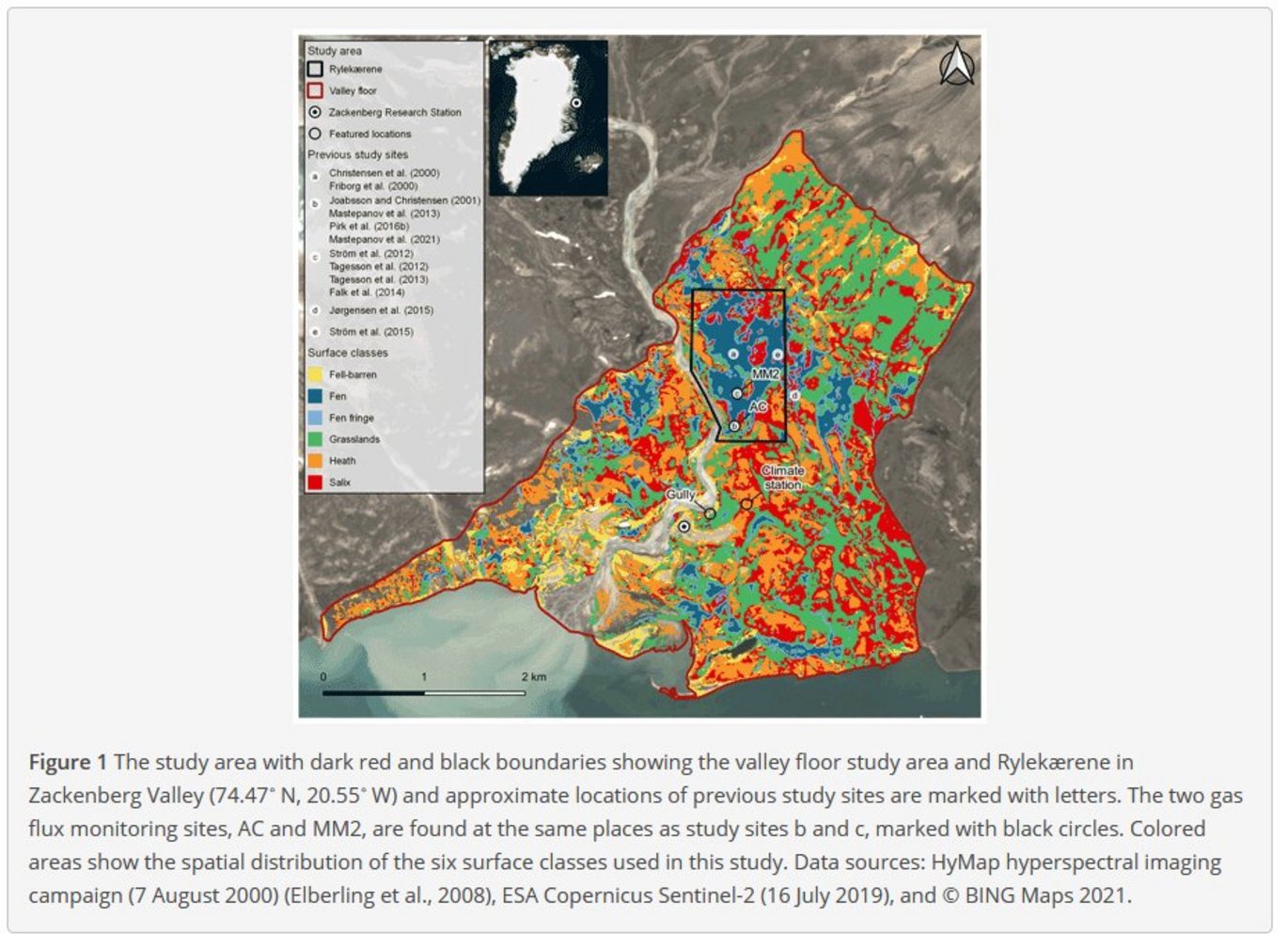 Here we combine multi-year July–August methane flux monitoring (2006–2019) from automated flux chambers in the central fens of Zackenberg Valley, northeast Greenland, with several flux measurement campaigns on the most common vegetation types in the valley to estimate the landscape fluxes over 14 years. Methane fluxes based on manual chamber measurements are available from campaigns in 1997, 1999–2000, and in shorter periods from 2007–2013 and were summarized in several published studies. The landscape fluxes are calculated for the entire valley floor and a smaller subsection of the valley floor, containing the productive fen area, Rylekærene.