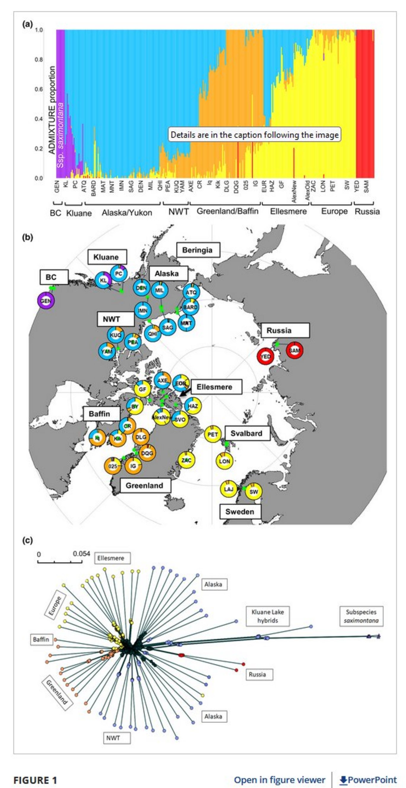 Abstract Aim Arctic plants survived the Pleistocene glaciations in unglaciated refugia. The number, ages, and locations of these refugia are often unclear. We use high-resolution genomic data from present-day and Little-Ice-Age populations of Arctic Bell-Heather to re-evaluate the biogeography of this species and determine whether it had multiple independent refugia or a single refugium in Beringia. Location Circumpolar Arctic and Coastal British Columbia (BC) alpine. Taxon Cassiope tetragona L., subspecies saximontana and tetragona, outgroup C. mertensiana (Ericaceae). Methods We built genotyping-by-sequencing (GBS) libraries using Cassiope tetragona tissue from 36 Arctic locations, including two ~250- to 500-year-old populations collected under glacial ice on Ellesmere Island, Canada. We assembled a de novo GBS reference to call variants. Population structure, genetic diversity and demography were inferred from PCA, ADMIXTURE, fastsimcoal2, SplitsTree, and several population genomics statistics. Results Population structure analyses identified 4–5 clusters that align with geographic locations. Nucleotide diversity was highest in Beringia and decreased eastwards across Canada. Demographic coalescent analyses dated the following splits with Alaska: BC subspecies saximontana (5 mya), Russia (~1.4 mya), Europe (>200–600 kya), and Greenland (~60 kya). Northern Canada populations appear to have formed during the current interglacial (7–9 kya). Admixture analyses show genetic variants from Alaska appear more frequently in present-day than historic plants on Ellesmere Island. Conclusions Population and demographic analyses support BC, Alaska, Russia, Europe and Greenland as all having had independent Pleistocene refugia. Northern Canadian populations appear to be founded during the current interglacial with genetic contributions from Alaska, Europe and Greenland. We found evidence, on Ellesmere Island, for continued recent gene flow in the last 250–500 years. These results suggest that a re-analysis of other Arctic species with shallow population structure using higher resolution genomic markers and demographic analyses may help reveal deeper structure and other circumpolar glacial refugia.