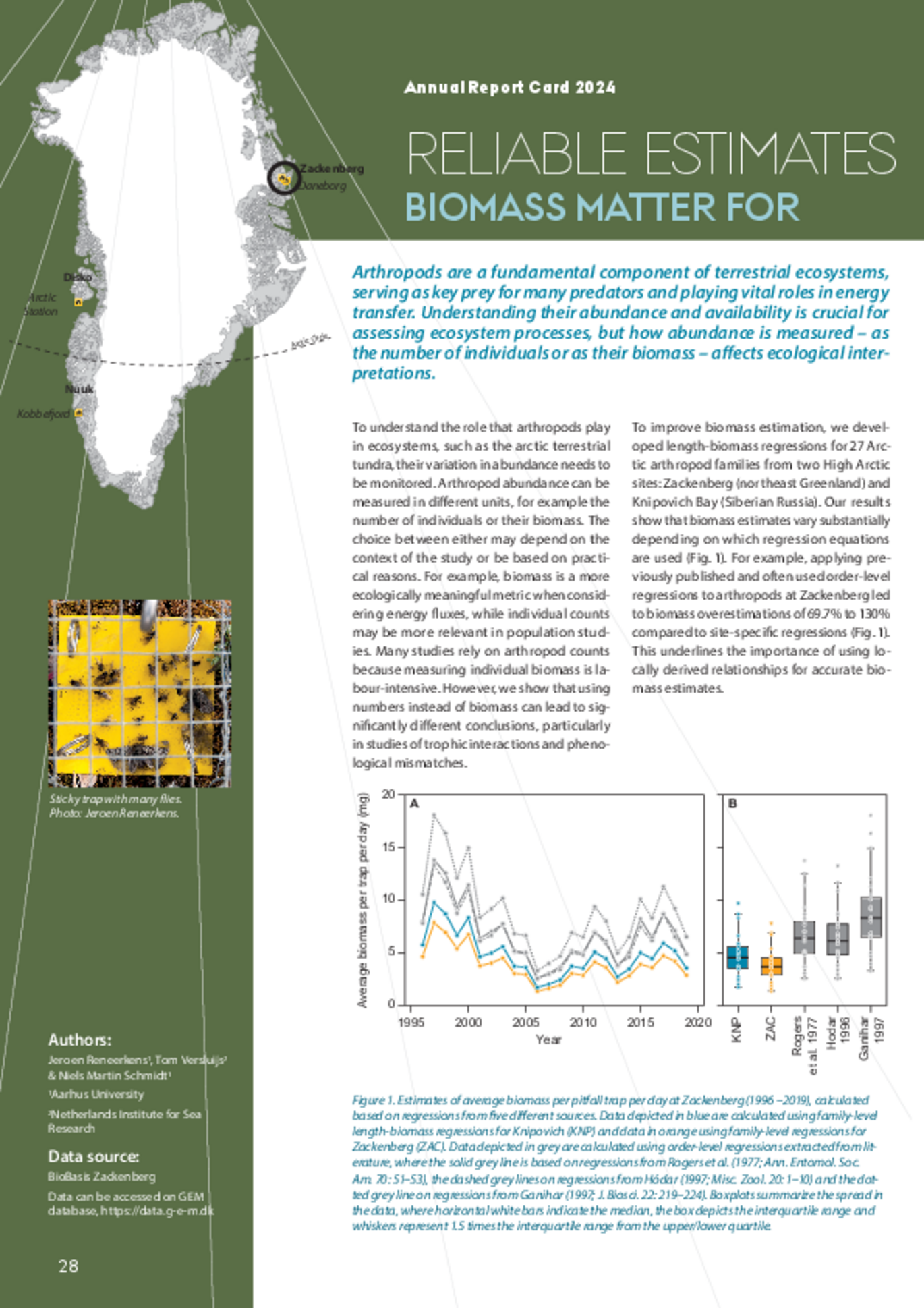 Insekter og andre leddyr spiller en vigtig rolle i terrestriske økosystemer, bl.a. som fødegrundlag for mange dyr. Det er derfor vigtigt at kende mængden af leddyr for at kunne forstå deres betydning for de processer, som leddyr er involverede i. Men om vi opgør mængden af leddyr som antal eller som biomasse, er afgørende for, hvordan vi forstår dynamikkerne. Læs historien, som er udkommet i årets Annual Report Cards 2024.