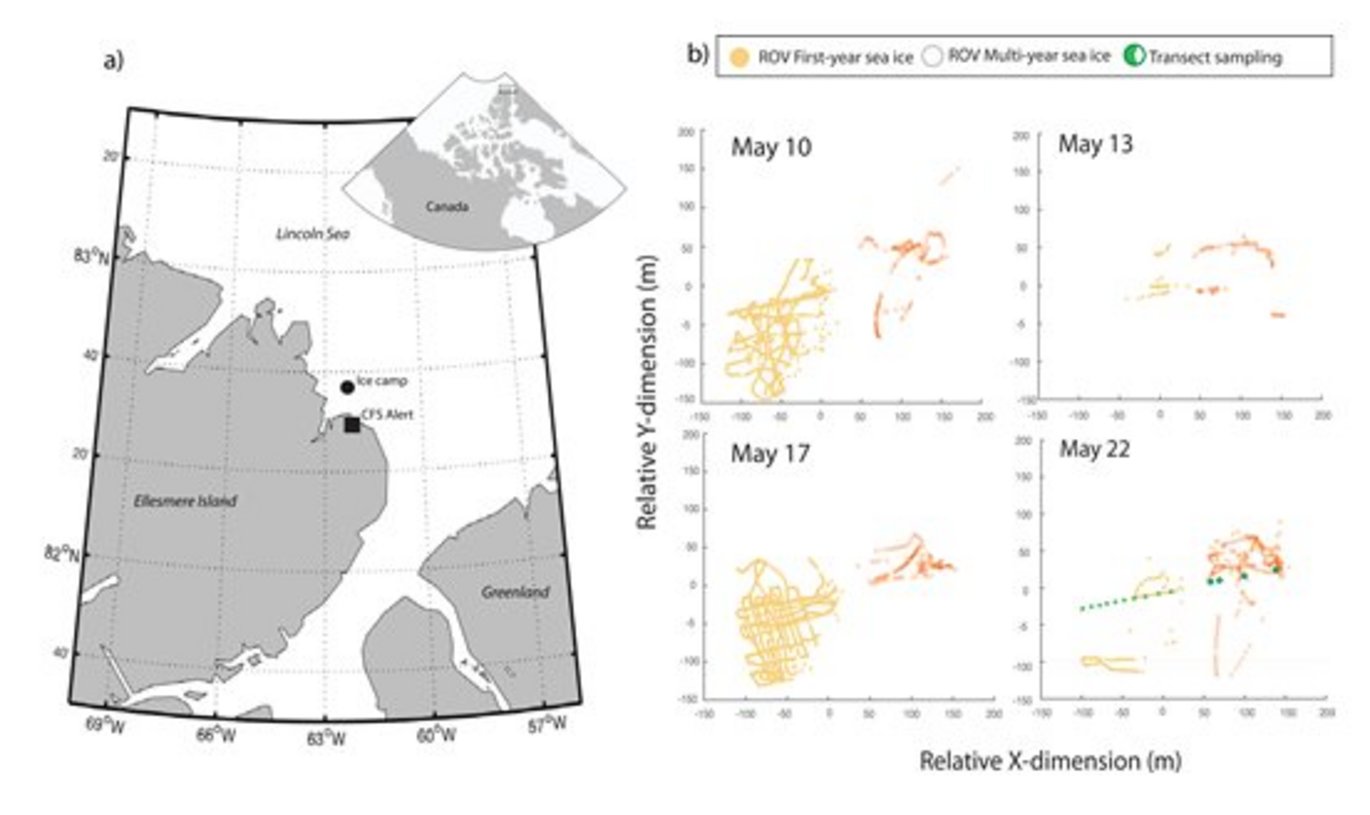 The net productivity of sea ice is determined by the physical and geochemical characteristics of the ice–ocean system and the activity of organisms inhabiting the ice. Differences in habitat suitability between first-year and multi-year sea ice can affect the ice algal community composition and acclimation state, introducing considerable variability to primary production within each ice type. In this study, we characterized the biogeochemical variability between adjacent first-year and multi-year sea ice floes in the Lincoln Sea of the Canadian High Arctic, during the May 2018 Multidisciplinary Arctic Program—Last Ice sampling campaign. Combining measurements of transmitted irradiance from a remotely operated underwater vehicle with laboratory-based oxygen optode incubations, this work shows widespread heterotrophy (net oxygen uptake) in the bottom 10 cm of both ice types, particularly in thick multi-year ice (>2.4 m) and early morning of the 24-h day. Algal acclimation state and species composition varied between ice types despite similar net community production due to widespread light and nutrient limitation. The first-year ice algal community was increasingly dominated over spring by the potentially toxin-producing genus Pseudonitzschia that was acclimated to high and variable light conditions characteristic of a thinner ice habitat with mobile snow cover. In comparison, the multi-year ice harbored more shade-acclimated algae of mixed composition. This work highlights the potential for heterotrophy in sea ice habitats of the High Arctic, including first measurements of such O2-uptake in multi-year ice floes. Observed differences in photophysiology between algae of these sea ice types suggests that a shift toward higher light availability and a younger sea ice cover with climate change does not necessarily result in a more productive system. Instead, it may favor future sea ice algal communities of different species composition, with lower photosynthetic potential but greater resilience to stronger and more variable light conditions.