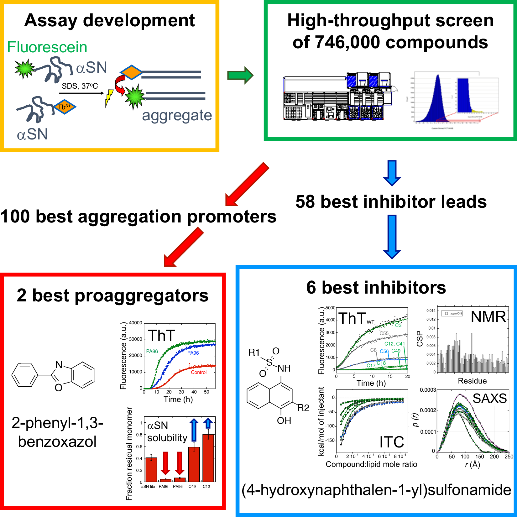 However, in the new screening strategy, the researchers first developed a smart trick to make αSN aggregate in a more predictable way using the “soap” molecule sodium dodecyl sulfate. To detect the aggregates, they then used Förster Resonance Energy Transfer (FRET), a widely used technique for measuring distances within and between molecules. In this way they were able to screen 746,000 compounds for their ability to inhibit αSN aggregation. By sifting through the results, they came up with a collection of structurally diverse, novel small compounds that either prevent (inhibitor) or accelerate (proaggregator) αSN aggregation. The six best inhibitors share a common core structure and these compounds all interact with the first part of αSN, called the N-terminal region.