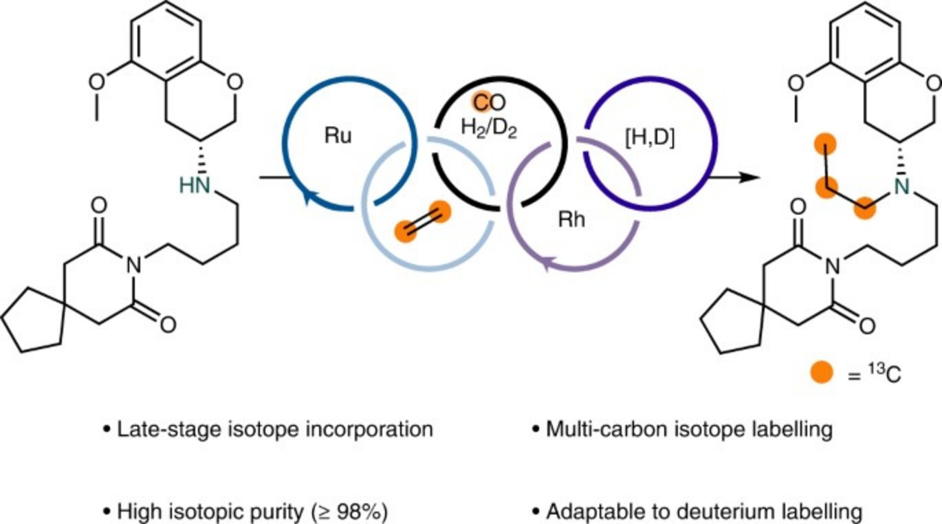 Abstract: Drug metabolism and pharmacokinetic studies play a crucial role in drug discovery and development programmes, assessing a lead drug candidate’s efficacy and safety profile. Quantitative bioanalytical assessment of analytes with mass spectrometry requires the use of stable carbon-13-labelled compounds with a molecular mass difference of ≥3 daltons. The incorporation of three or more carbon isotopes into drug candidates is not trivial, often requiring lengthy and costly syntheses. Here we report a dual catalytic strategy for the synthesis of multi-carbon-labelled isotopologues of active pharmaceutical ingredients. This approach uses isotopically labelled gas surrogates in a three-chamber reactor for sequential release of alkenes, carbon monoxide and hydrogen followed by low-pressure hydroformylation to generate multi-labelled alkyl aldehydes. The method’s utility has been demonstrated through the synthesis of multiple labelled N-alkyl bioactive compounds, site-selective carbon-13 and deuterium introduction and for triple-carbon labelling of small molecules combined with α-functionalization.