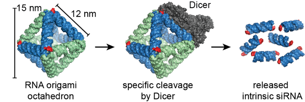 Figure: A 3D scaffolded RNA origami octahedron with intrinsic siRNAs. The enzyme Dicer binds the structure (1) at specific recognition sites and cleaves the structure, which releases the siRNAs (2). The octahedron was demonstrated to efficiently silence a target reporter gene when transfected into H1299 cells.
