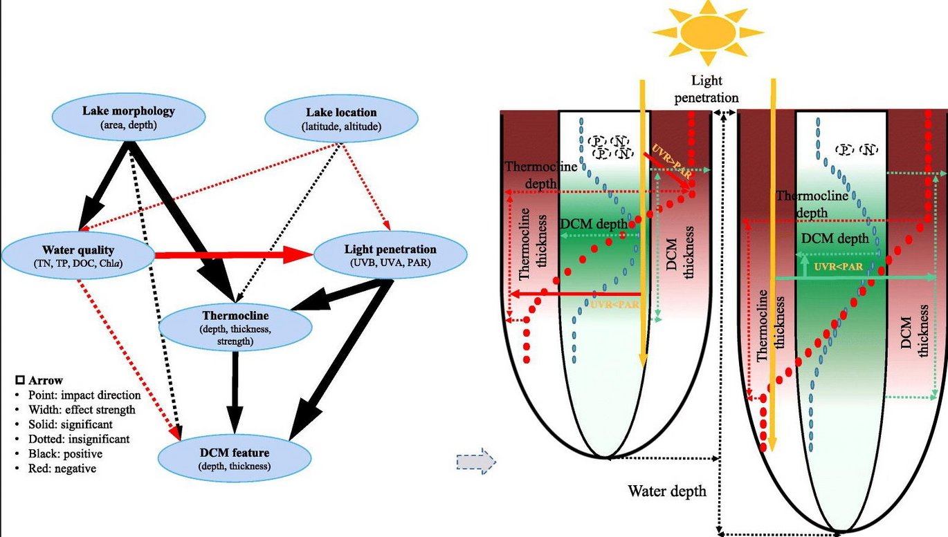 Thermal stratification and the deep chlorophyll maximum (DCM), two commonly related phenomena in stratified lakes, play fundamental roles in eco-environmental processes. However, the progressive linkages among multi-dimensional environmental factors, thermal stratification and DCM were poorly explored, which greatly constrains our understanding of cross-level governance in deep lakes. In this study, the thermocline structure (i.e., thermocline depth, thickness and strength) and DCM feature (depth and thickness) and their driving factors were investigated at regional scale using data from 18 stratified lakes differing in limnological characteristics, Southwest China. Our study showed that (1) DCM occurred close to the thermocline in most lakes (represented by their depth and thickness), (2) the depths of the thermocline and DCM were both shallower than the euphotic depth, and (3) spatial heterogeneity occurred the thermocline structure and the DCM feature, reflecting different environmental factors. Specifically, water depth and light penetration depths were both positively correlated with thermocline depth and thickness and the DCM feature, and ultraviolet radiation (UVR) was more important than photosynthetically active radiation (PAR) for thermocline depth, but PAR was more important for thermocline thickness; moreover, PAR played a more prominent role than UVR for the DCM feature. As there were interactions between some environmental factors, we built a cascading path using a partial least squares path modelling for the DCM feature: lake morphometry directly impacted the thermocline structure and surface water quality; the water quality further affected light penetration depths as well as the thermocline structure; light penetration depth and thermocline structure combined directly determined the DCM feature, where the importance of light was larger. Our findings provide information on the cascading drivers of the thermocline structure and DCM feature in deep lakes and also constitute a valuable reference for deep lake management under the dual pressure of climate change and eutrophication.